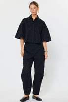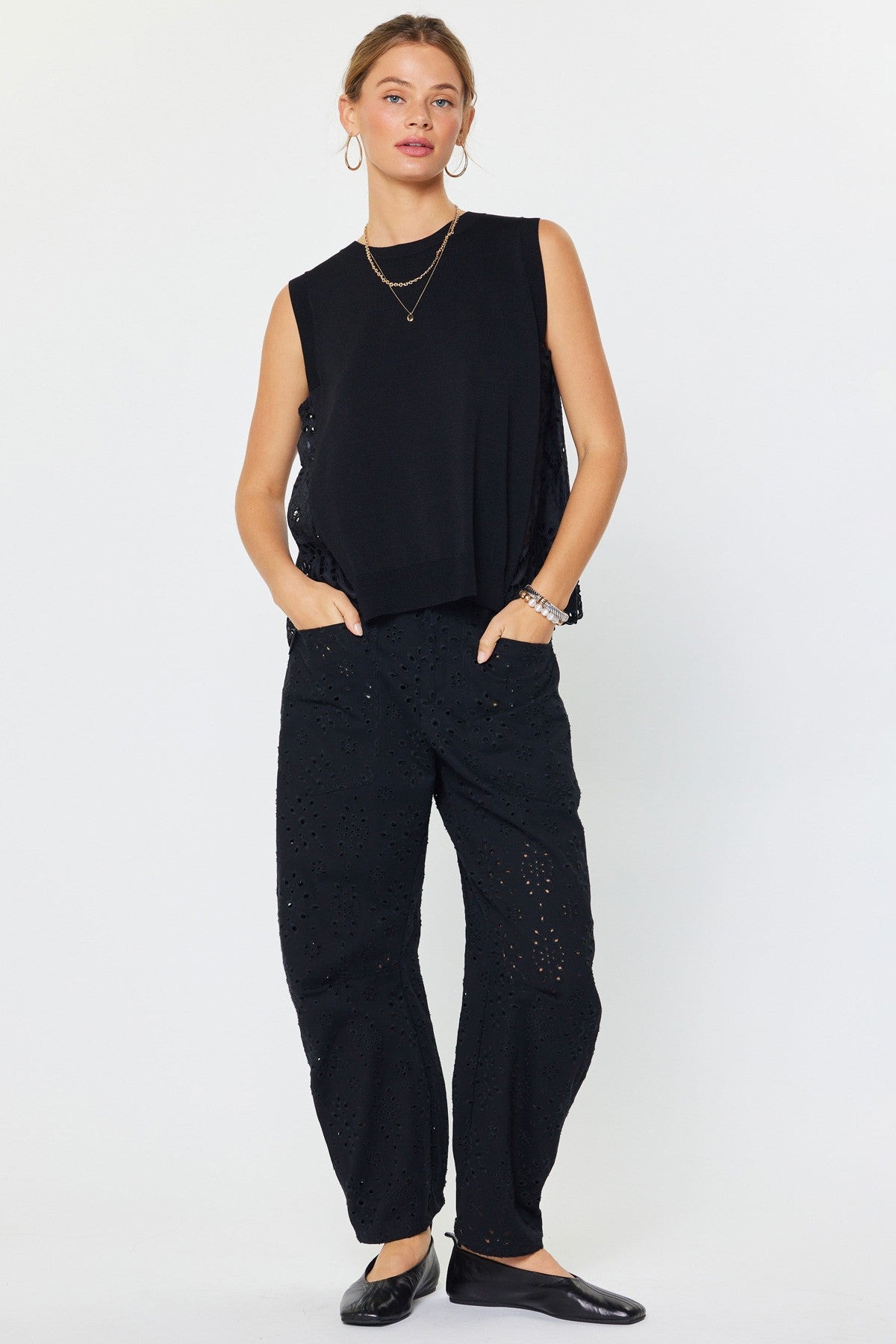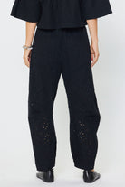 These black cotton eyelet pants are the perfect mix of tailored and feminine. Designed in a breathable embroidered cotton, they feature delicate allover eyelet detailing that adds texture and subtle dimension while still feeling polished. The relaxed barrel leg silhouette gives them that modern, slightly sculpted shape that’s trending, while the high-rise waist flatters and defines. Finished with belt loops, a classic button and zip fly closure, and functional front and back patch pockets, they balance structure with ease. The ankle-length cut keeps them versatile — style with flats for an effortless daytime look or pair with a heel and the coordinating top for a chic, elevated set moment. Style with the matching shirt jacket or basic top.