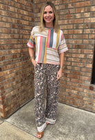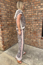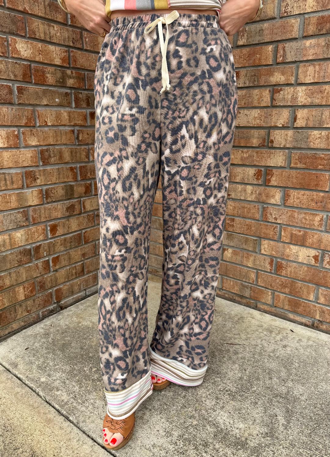 These super soft french terry pants bring comfort and statement style together. Featuring a neutral leopard print and contrast striped side panels, they offer just the right amount of detail to elevate your lounge look. The relaxed wide-leg silhouette drapes beautifully, while the easy pull-on waistband keeps them comfortable all day long. Finished with striped trim at the hem, they pair perfectly with the matching hoodie, Mixed Stripe Top, a solid tee or sweater for a laid-back, polished feel.