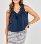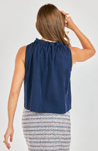 This sleeveless top is crafted from a smooth lyocell–cotton blend that feels soft, breathable, and fluid against the skin. Designed with a gently gathered neckline and subtle ruffle trim, it creates an easy, flattering drape without feeling fussy. The adjustable tie-front detail adds a touch of femininity, while the relaxed silhouette makes it effortless to tuck or wear loose. Polished yet unfussy, it’s the kind of elevated basic that transitions seamlessly from workdays to evenings out with practically any bottom.