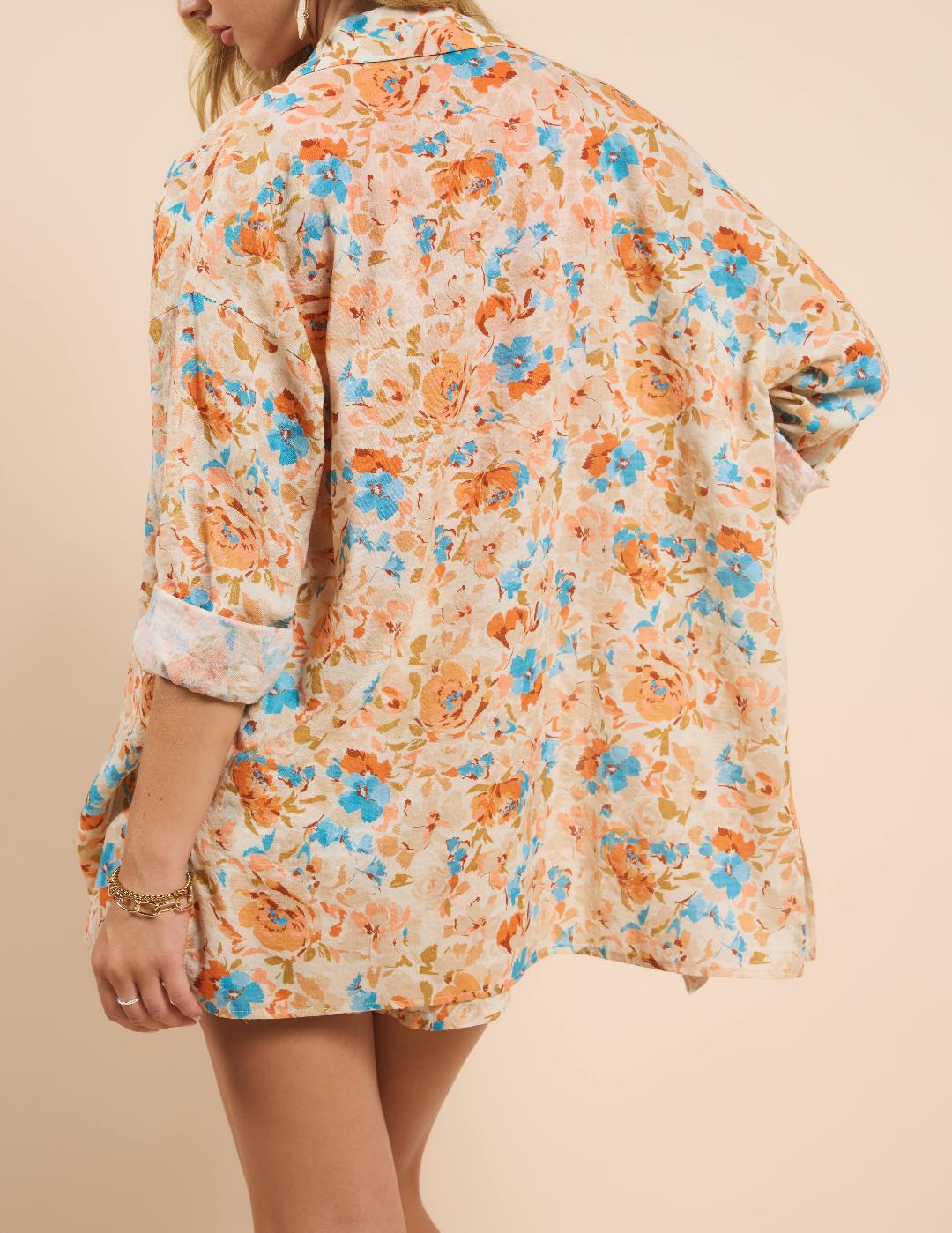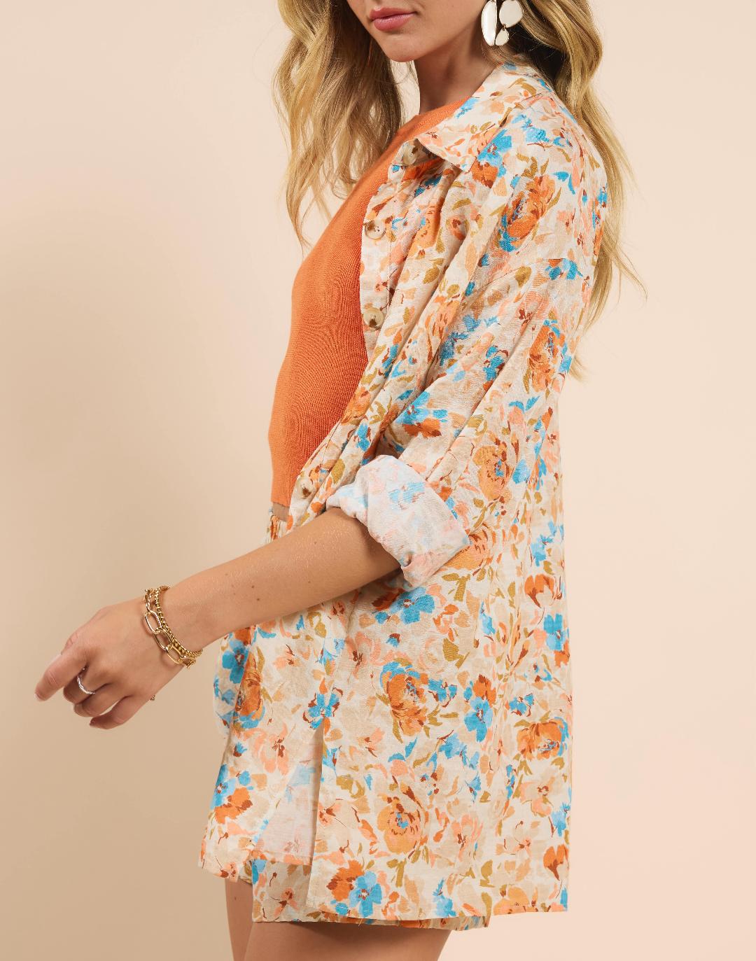 This easy, breezy button up shirt boasts a beautiful, eye-catching blue and soft orange floral print. Style back to the Alexis Knit Tank and the matching short.