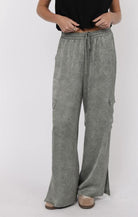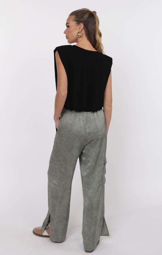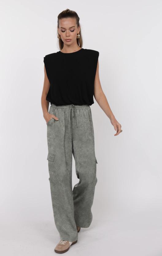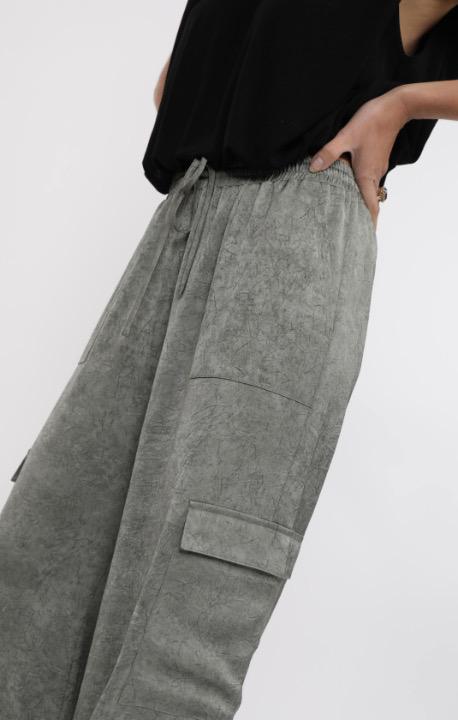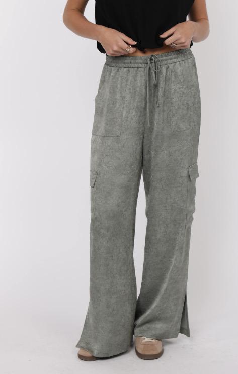 Effortlessly cool with a touch of luxe—these wide-leg cargo pants feature a soft crinkled satin texture, elastic drawstring waist, and side flap pockets for that utilitarian edge. The sage hue transitions seamlessly from summer to fall, while subtle front pleats and side slits add movement and style. Dress them up or down for an elevated take on casual comfort. For a chic day-to-night look style with the matching top.