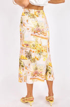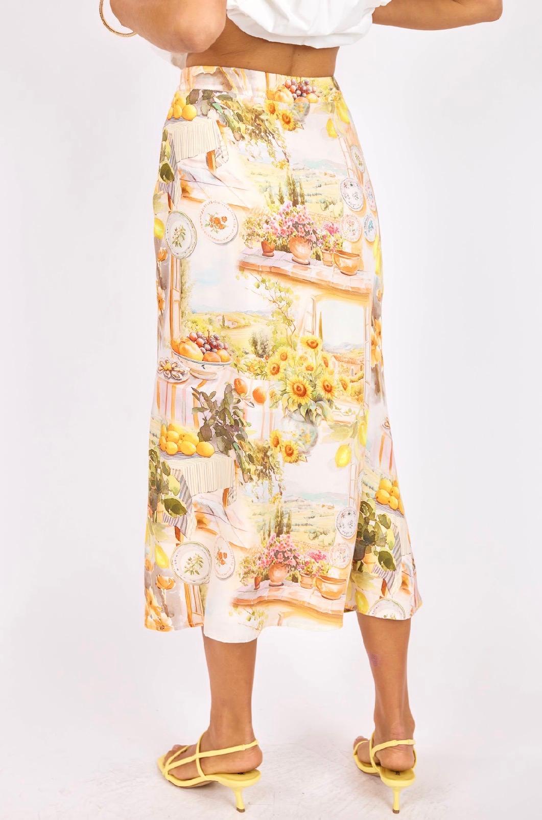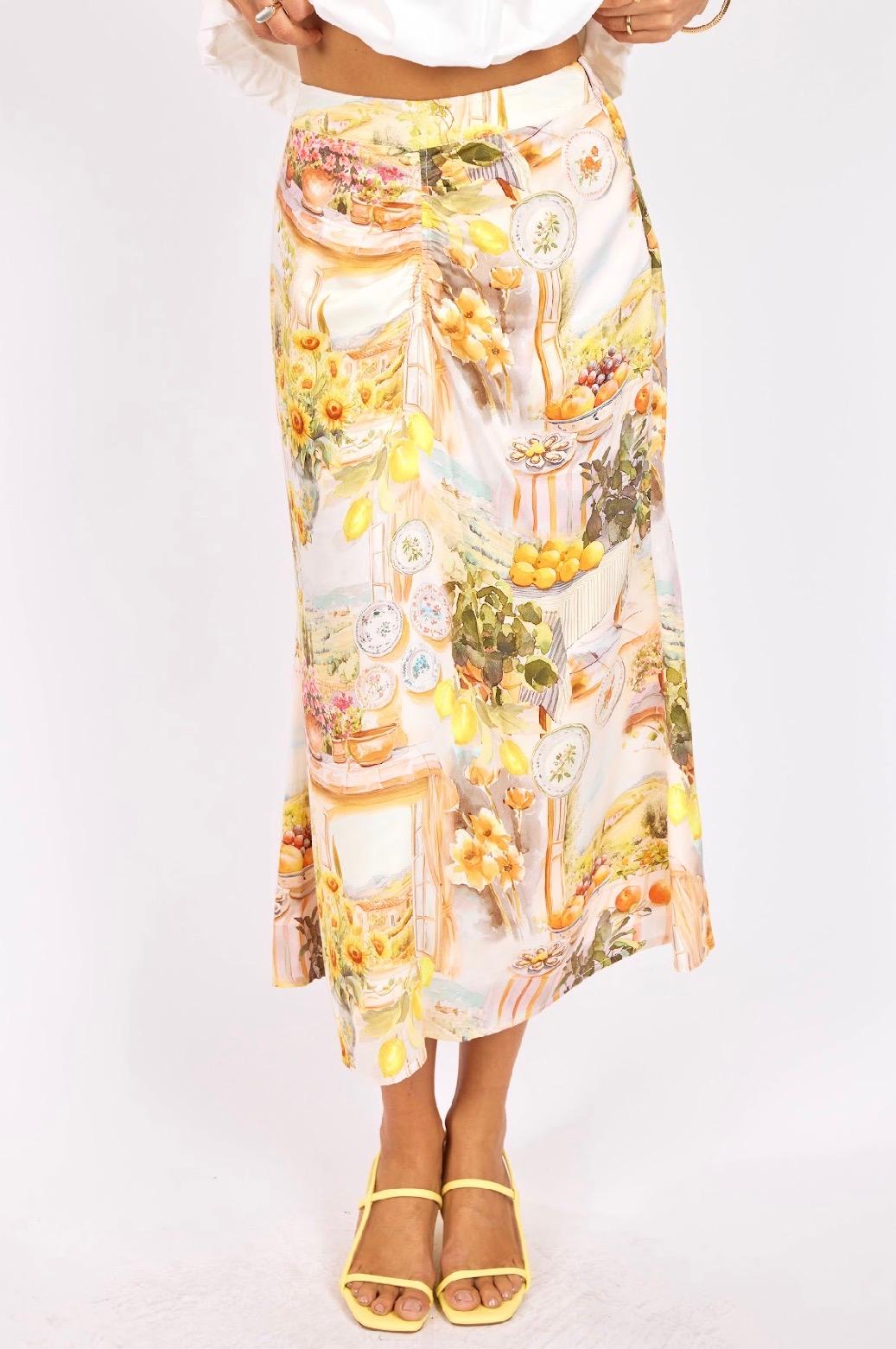 This dreamy midi skirt features a soft, artful print with warm citrus tones and scenic details that give it a fresh, European-inspired feel. Designed with a flattering, easy drape, it skims the body beautifully while maintaining a lightweight, flowy silhouette. Subtle ruching at the front adds a touch of texture and shape, enhancing the fit in a soft, feminine way. The midi length makes it effortlessly versatile—perfect for dressing up with heels or keeping it casual with sandals. Style with our Alexis Avocado Knit Tank or the matching Limoncello Ruched Tank.
