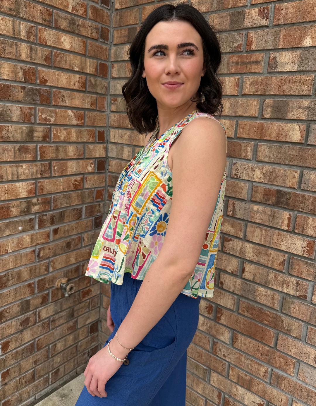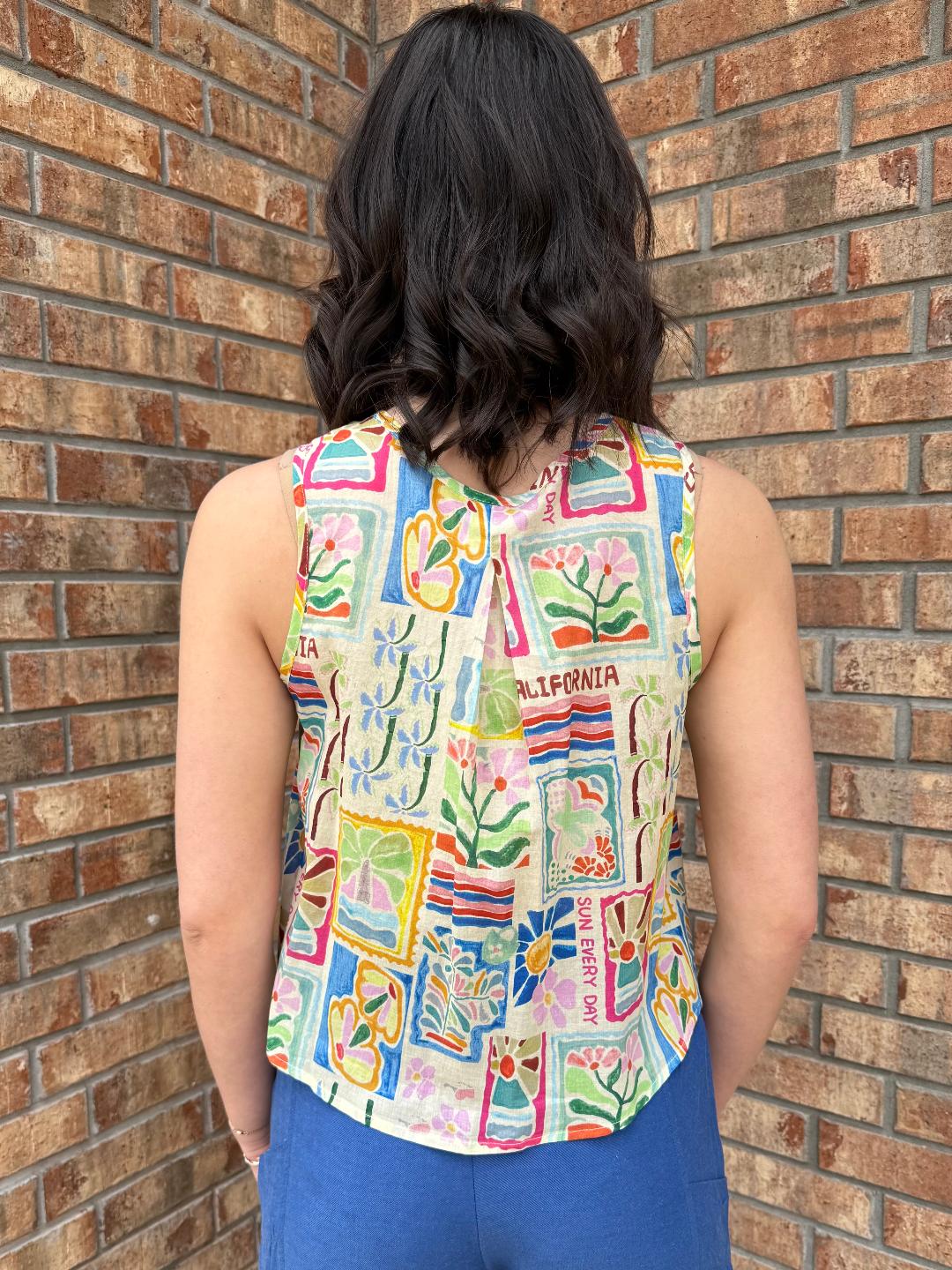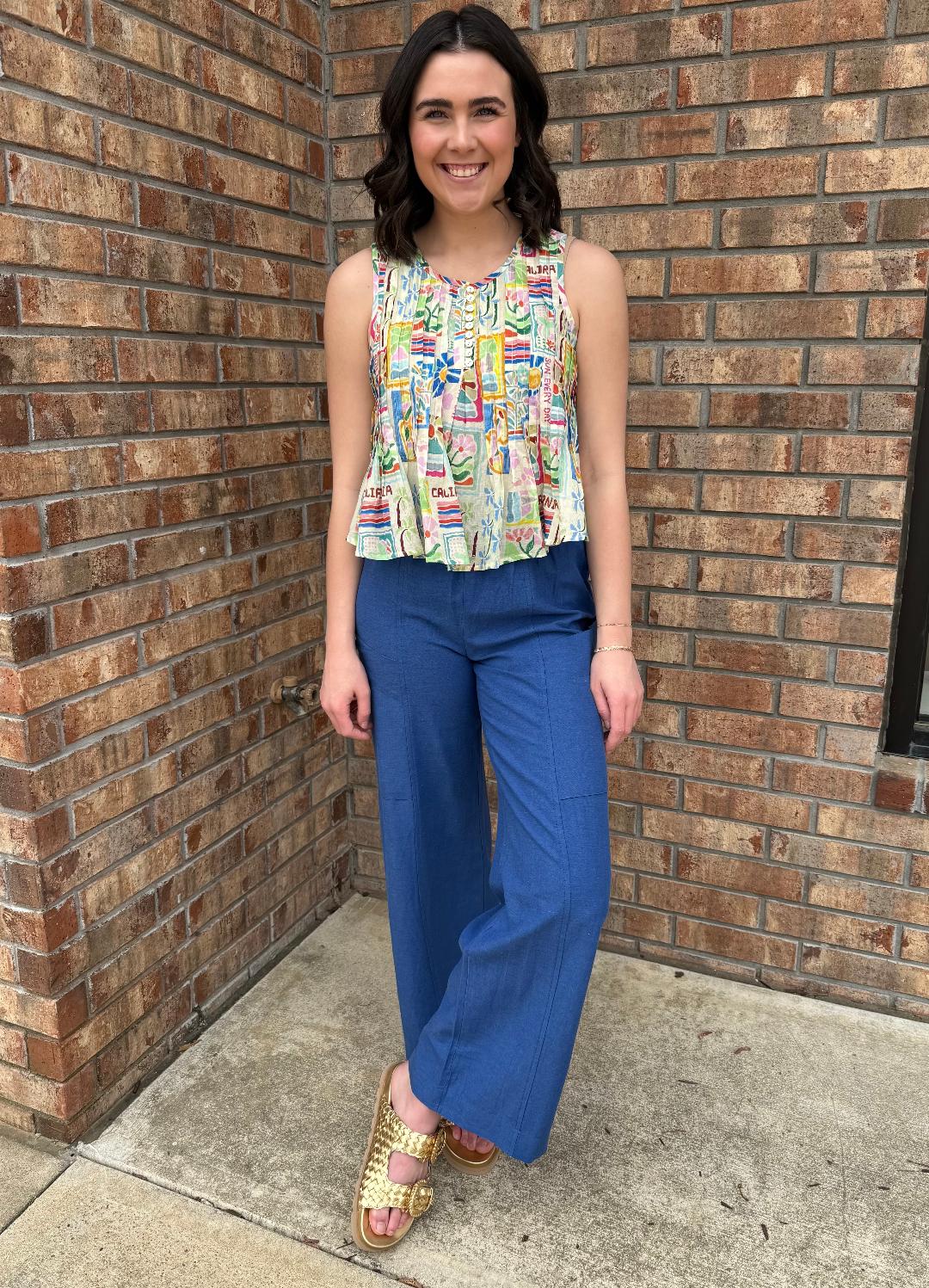 Elevate your style with our Amey Top, a stunning button front tank with delicate pleats. This top effortlessly combines elegance with versatility, making it perfect for any occasion. From a day at the office to a night out with friends, the Amey Top is sure to turn heads during warm summer months. Style it with our Garnet Pant to pull out the shades of blue.