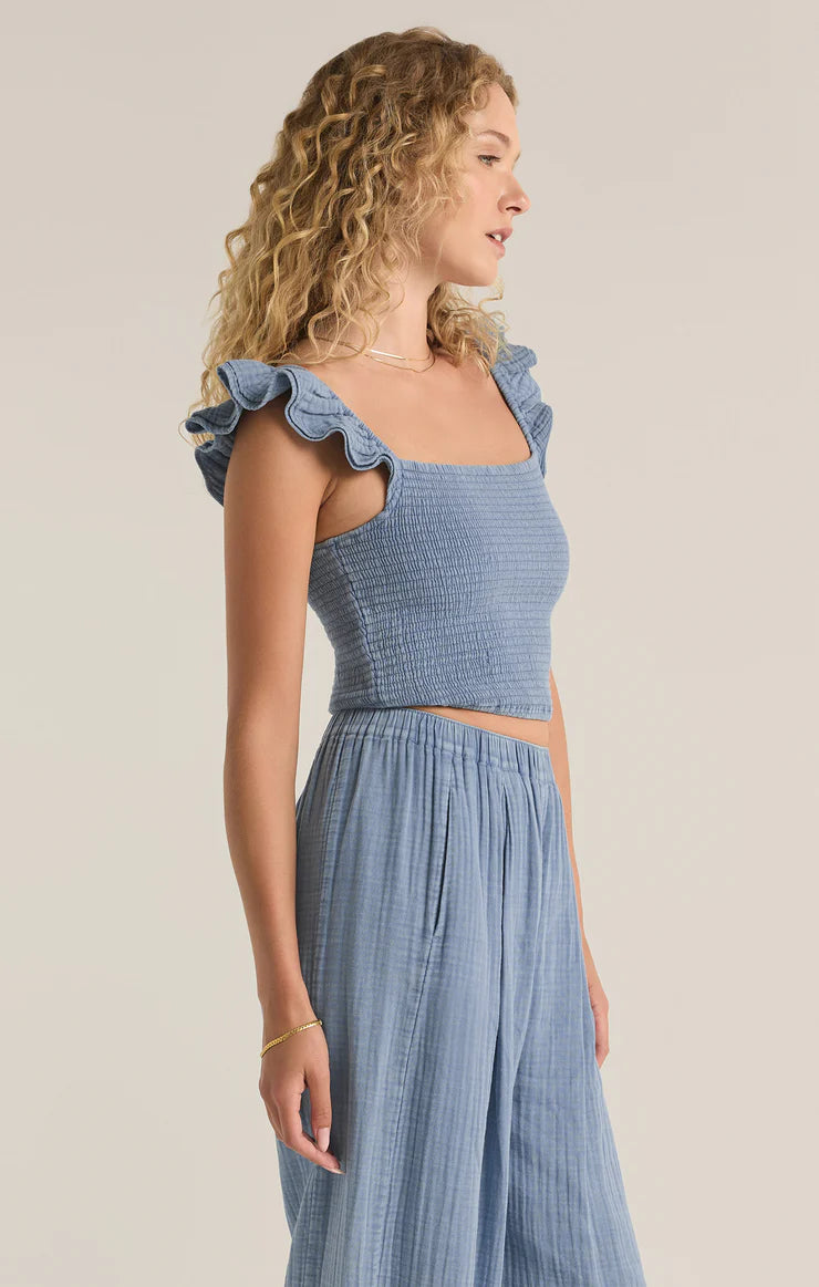 Step up your warm weather wardrobe with this flattering and fun crinkle cotton top. The ruffle cap sleeves are meant to drape off the shoulders for a romantic summery look. We love it paired back to the Step Out Gauze Pant.