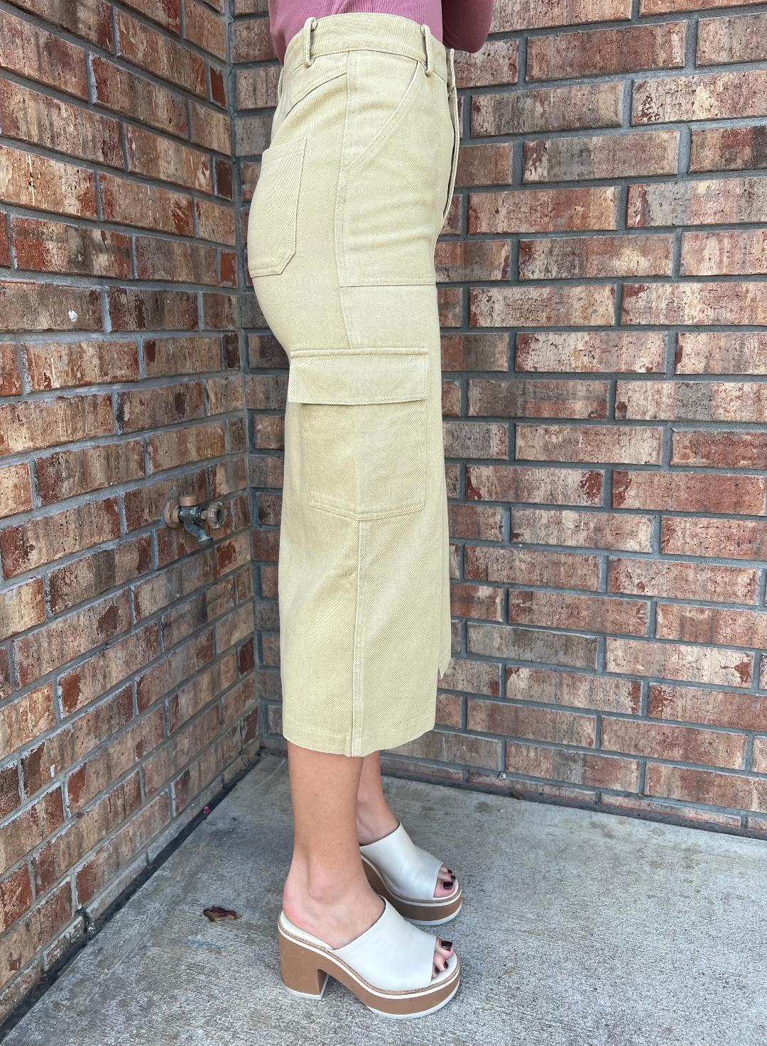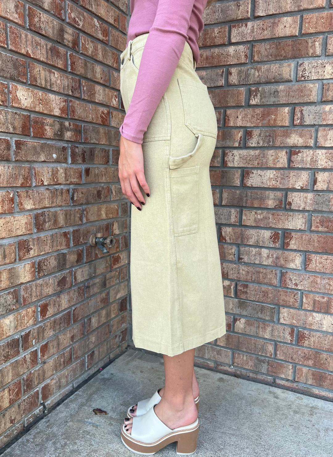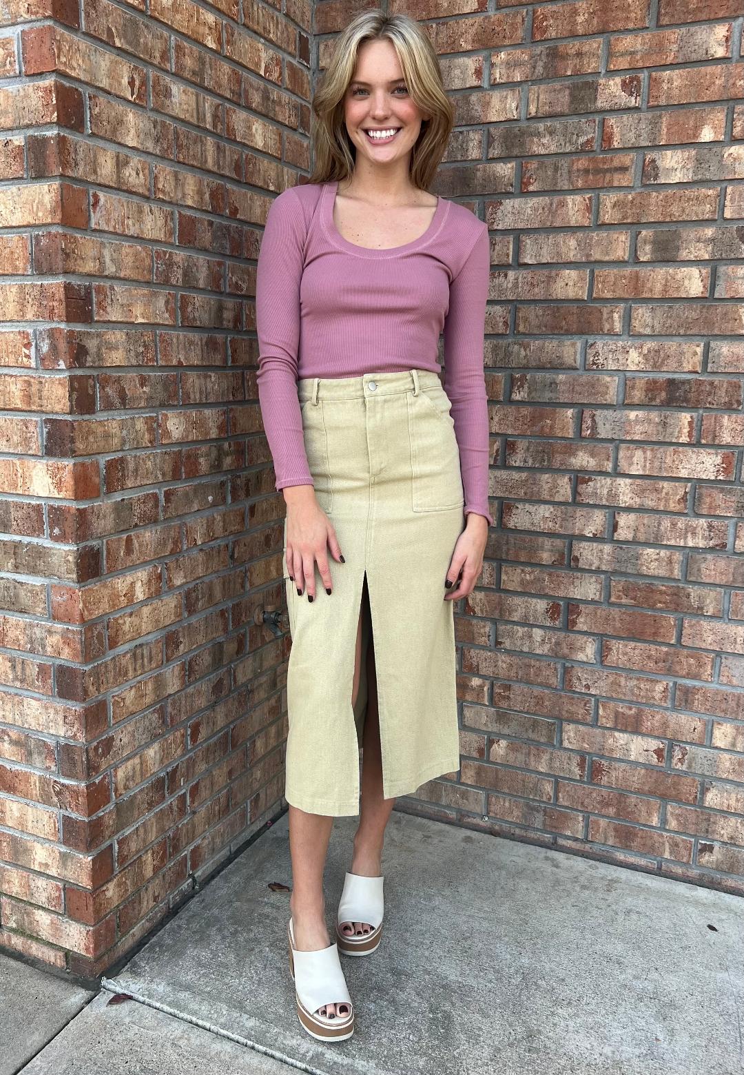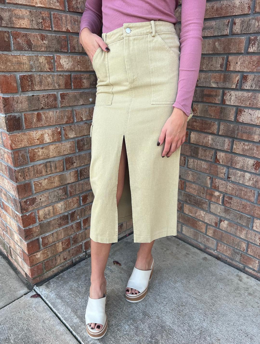 A neutral khaki denim skirt right on trend with the cargo and denim skirt styles that are so hot! We love this styled with sneakers and a tee or boots and a sweater. Your options are endless!