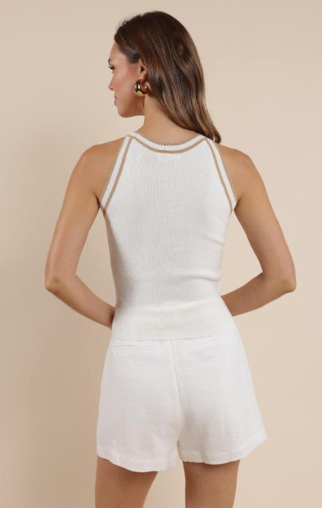 Clean, crisp, and effortlessly chic — The Inez Contrast Sweater Tank is your new go-to for polished summer layering. Designed with a flattering high neckline and subtle contrast trim, this ribbed knit tank hugs in all the right places while still keeping you cool. The neutral ivory hue with camel-toned edging makes it easy to pair with denim, linen, or tailored shorts for an elevated warm-weather look.