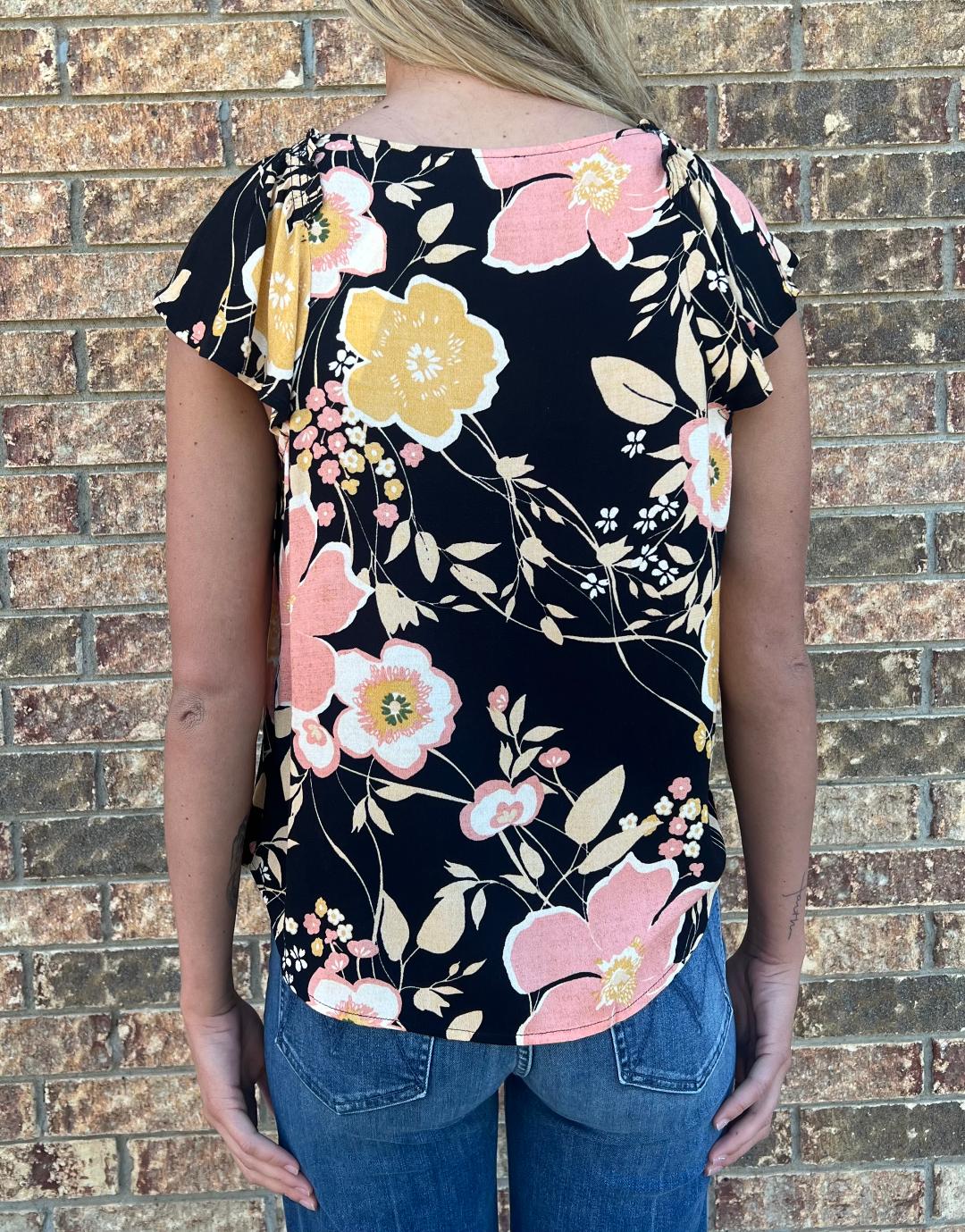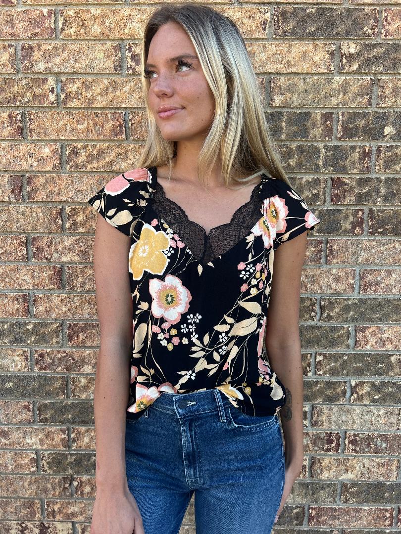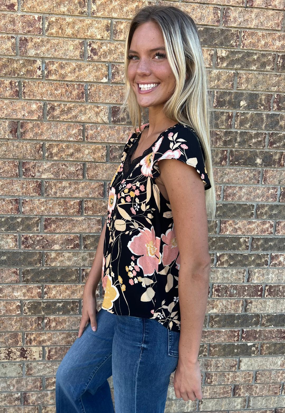 Pretty coral, light beige, marigold and cream pop against a black background. Flutter sleeves and lace at the neckline add a flirty, feminine touch.