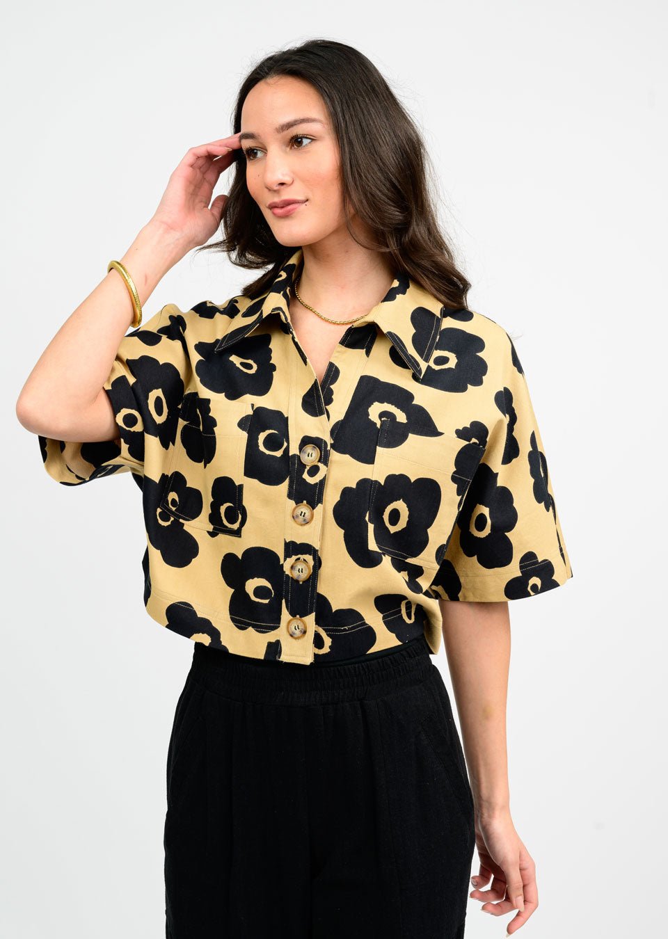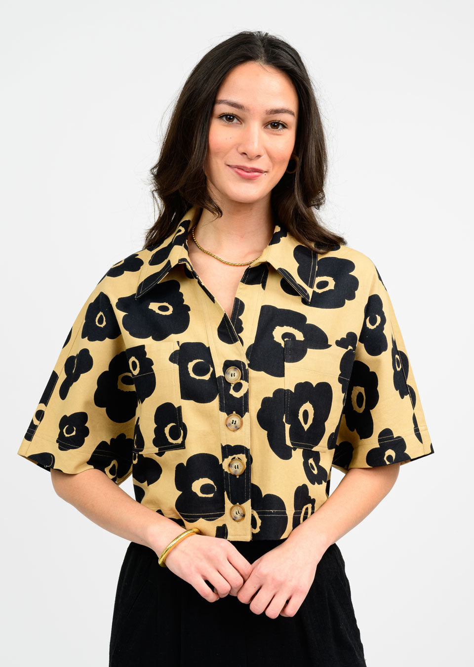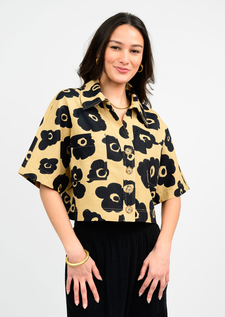 Fresh, fun, and versatile, this cropped jacket is a modern twist on a retro-inspired floral. Featuring a boxy fit, button-down front, and short sleeves, it’s the perfect layer to throw on with high-rise denim or styled as a matching set with the coordinating pants. The oversized black floral print makes it a true conversation piece.