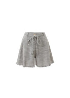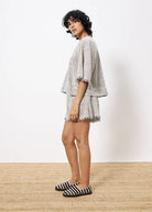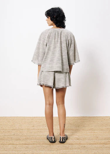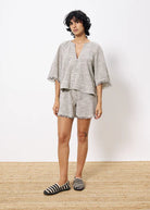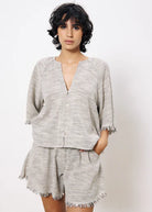 Easy, effortless, and undeniably chic — The Alyssia Set is your new favorite off-duty look. Featuring a soft woven texture in a neutral micro-stripe, this matching set is all about comfort with elevated details. The Anastazia Short, which features a high waist, fringed hem, and a rope-style belt, this set is perfect for beach days, weekend markets, or casual summer brunches. The matching Alyssia Blouse offers a relaxed silhouette with wide kimono-style sleeves, a deep split neckline, and delicate button-down closure.