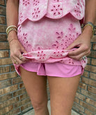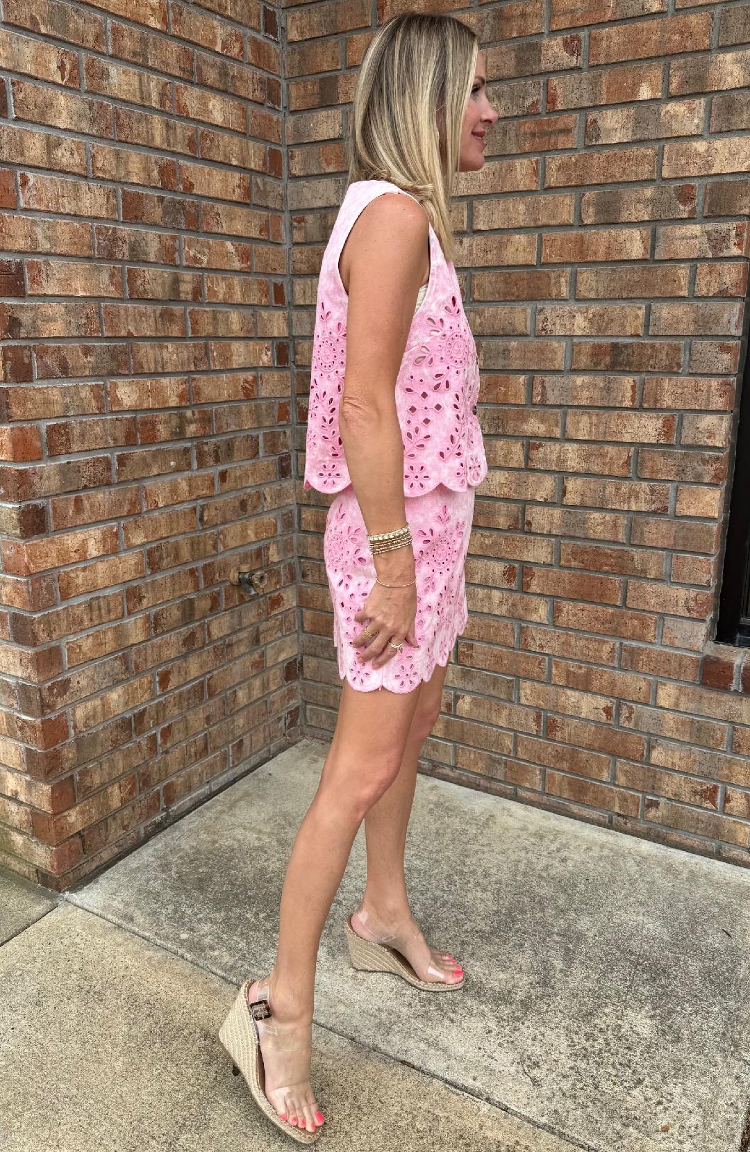 A pink washed mini skirt with allover eyelet embroidery for an elevated look. Designed with a clean, streamlined fit, it features a flattering high-rise silhouette and scalloped hemline that mirrors the vest. Fully lined with built-in shorts underneath for added coverage and ease, it blends feminine detail with everyday wearability. Perfect styled as a set or paired back to your favorite basics.