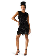 This black velvet mini dress channels vintage-inspired glamour with a modern edge. Designed with a sleeveless, structured silhouette, it features velvet fabric adorned with vertical sequin stripes that catch the light from every angle. Layered zigzag rows of sequins and sequin fringe create dynamic texture and movement, perfect for a night out or festive occasion. Finished with a keyhole back closure, this statement piece exudes both sophistication and sparkle—ideal for holiday parties or evening events.
