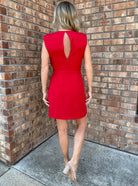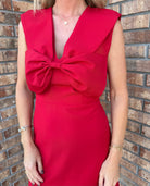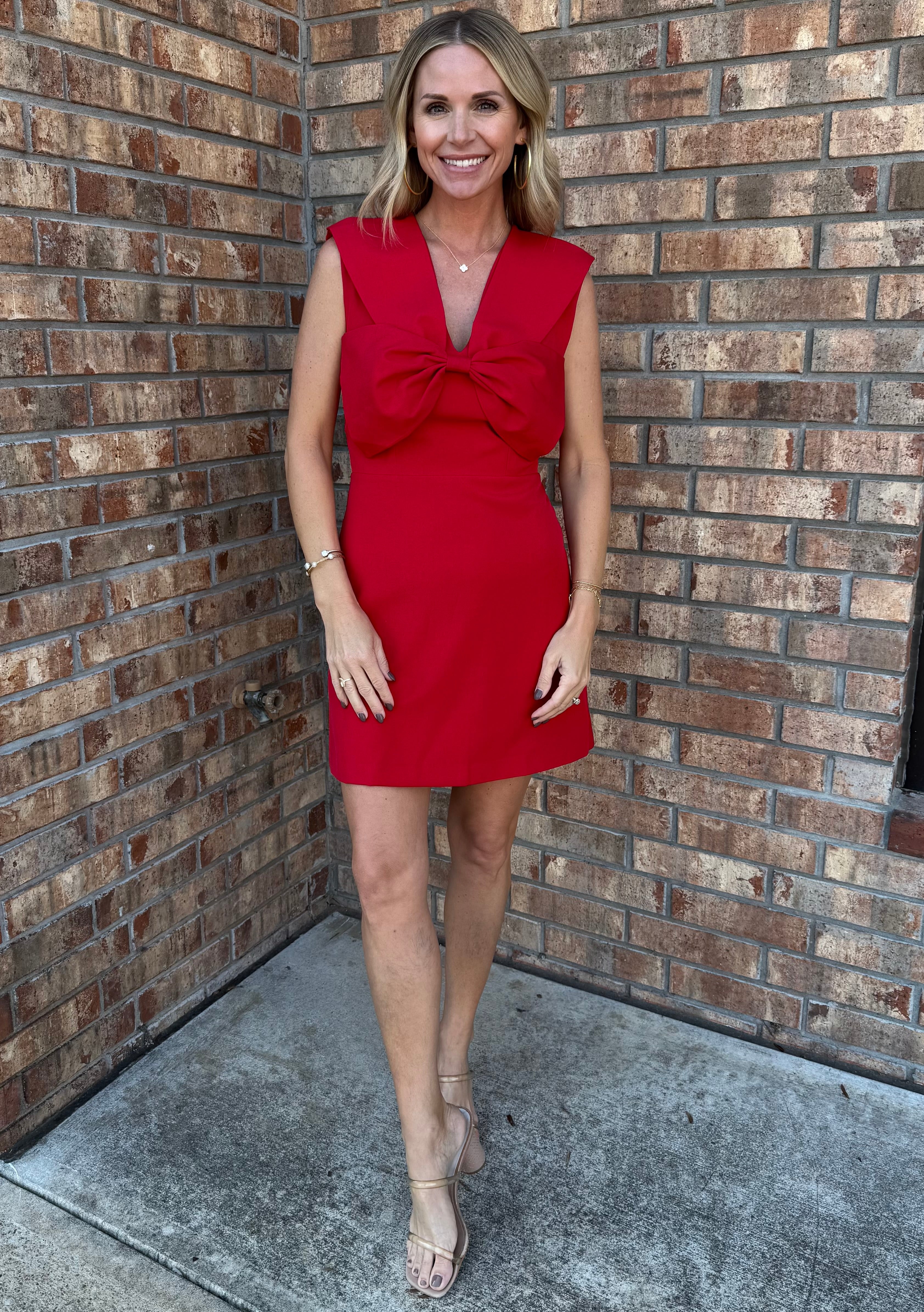 This striking red mini dress is the definition of chic and confident. Designed with a structured sleeveless silhouette, it features a deep V-neckline accented by an oversized bow detail that makes a bold yet feminine statement. The fitted waist and clean A-line skirt create a flattering, streamlined shape, while the back keyhole with a button and hidden zipper closure adds a polished finish. Crafted from a smooth woven fabric with a hint of stretch, this dress holds its shape beautifully—perfect for holiday parties, fall weddings, or any special dinner event. Pair it with nude or metallic heels and minimal jewelry to let that standout bow take center stage.