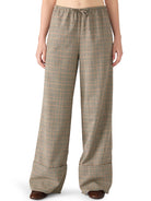 These pants are a modern twist on classic tailoring, designed in a relaxed plaid fabric that blends sophistication with comfort. They feature a wide-leg silhouette with exaggerated cuffed hems that add a statement finish. An elastic waistband with a drawstring tie ensures an easy, adjustable fit, while side pockets bring in everyday practicality. The neutral plaid pattern in soft beige, brown, and muted tones makes them versatile for pairing with everything from a tucked-in blouse to a chunky sweater. Perfect for elevating casual looks or giving workwear a laid-back edge. Try with our Hermia Sweater or the Rafi Top.