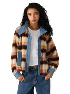 This standout jacket delivers cozy texture with a major style moment. Designed in a bold, multi-color brushed plaid, it features a soft, fuzzy finish that feels as good as it looks. The contrasting denim trim instantly elevates the piece—framing the collar, button placket, cuffs, and pockets with a crisp pop of blue. A high snap-neck closure offers warmth on cooler days, while the roomy, relaxed silhouette and lightly ballooned sleeves give it that effortlessly chic, throw-on-and-go feel. Front patch pockets add function without sacrificing style. Pair it with denim and a fitted tee for everyday wear, or layer it over a knit for a cozy, statement-making cold-weather look.