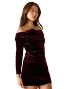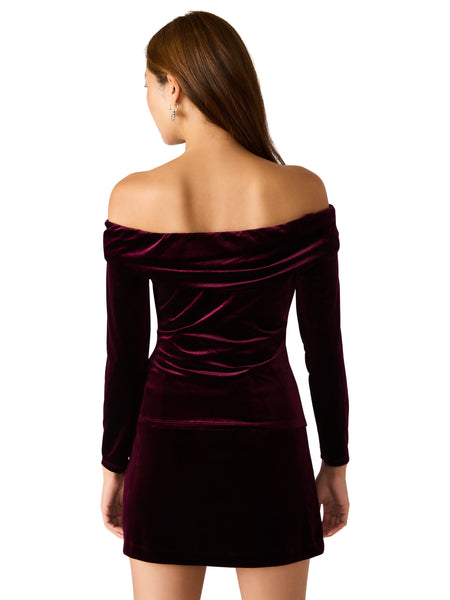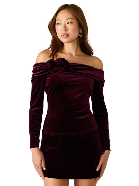 This off-the-shoulder velvet top exudes elegance with a touch of vintage charm. Crafted in a deep wine hue, it features a soft, stretch velvet fabric that hugs the body for a flattering fit. The draped neckline falls gracefully across the shoulders and is adorned with dimensional velvet rosettes for a romantic finish. Long fitted sleeves balance the sultry neckline, making it the perfect statement piece for holiday parties or evening occasions. Pair it with our black velvet Cindi Skirt or our glitzy Mavi Siena denim for a luxe, edgy look.