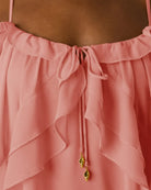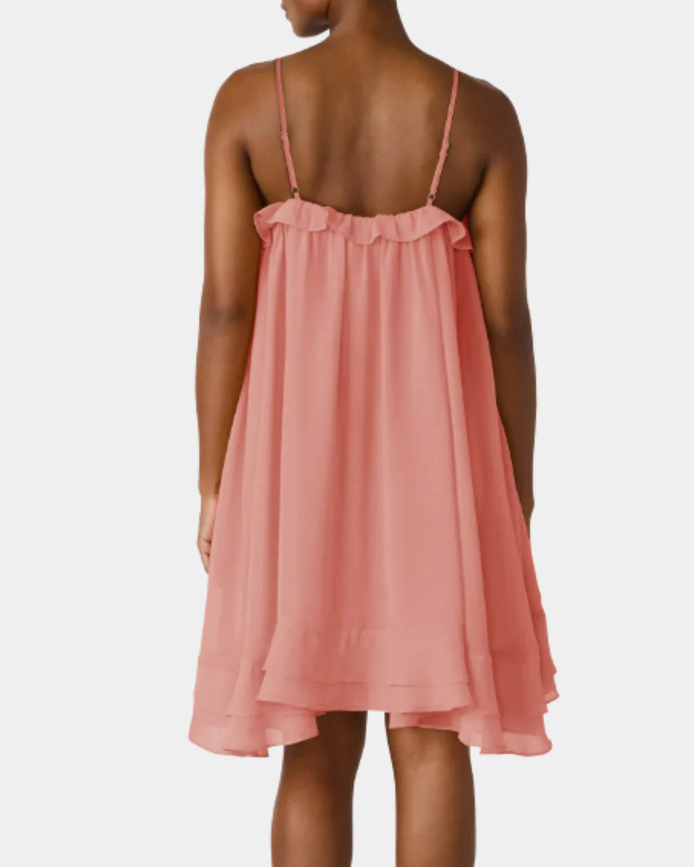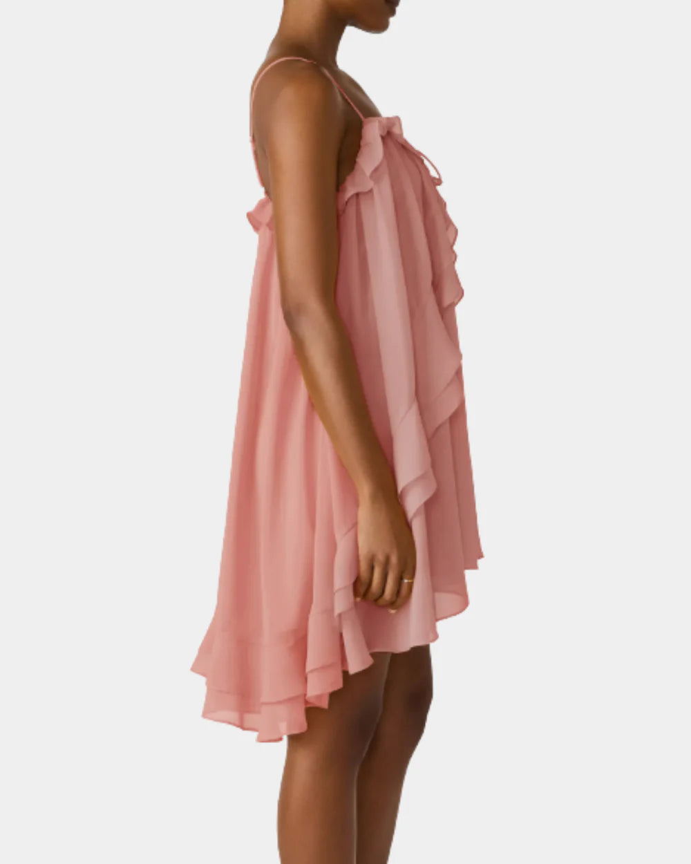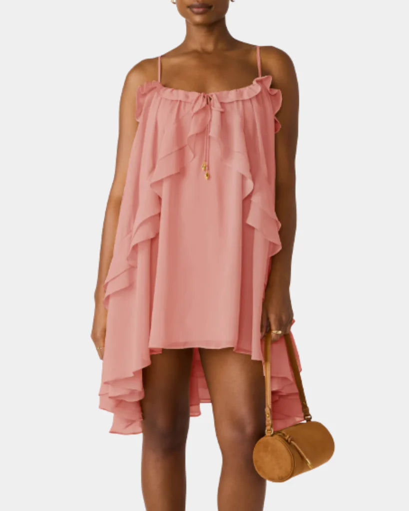 An effortlessly feminine chiffon dress designed with soft movement and romantic detail. This airy silhouette features a flowy, swingy fit that drapes beautifully with every step. The neckline is finished with a delicate ruffle trim and an adjustable tie-front detail, accented with subtle gold-tone charms for a hint of shine. Adjustable spaghetti straps allow for a customized fit, while cascading ruffle layers down the front add dimension and a flattering, elongating effect. The hemline is slightly longer in the back, creating a soft high-low shape that enhances its breezy feel. Lightweight and fully lined, this dress is perfect for warm days, vacations, or any moment you want an easy yet elevated look.