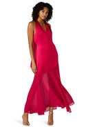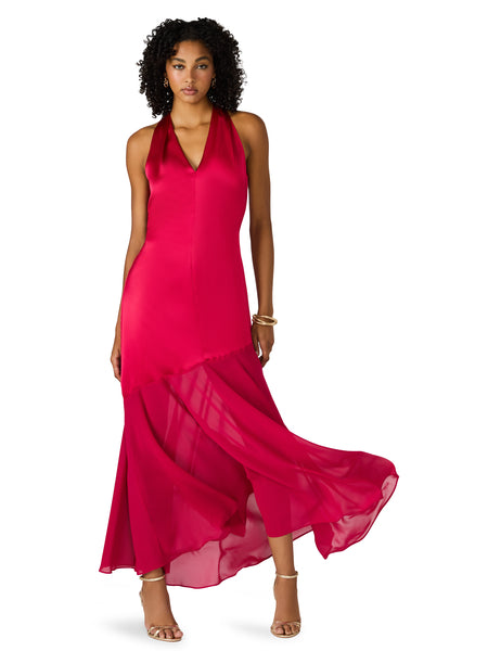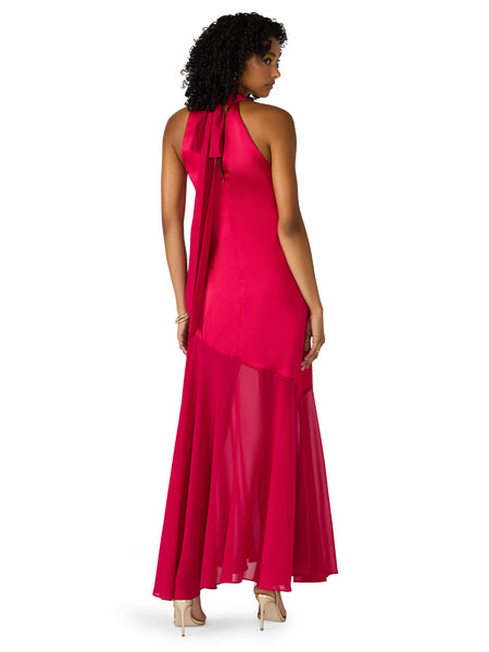 This vibrant halter-neck maxi dress delivers effortless drama with its fluid, asymmetric design. The bodice features a clean, minimal silhouette that elongates the frame, while the skirt transitions into a soft, sheer panel that adds movement and dimension with every step. A self-tie bow at the back of the neck brings a feminine finish, and the lightweight fabric creates a beautiful, graceful flow. Perfect for weddings, galas, holiday events, or any moment that calls for a striking pop of color.