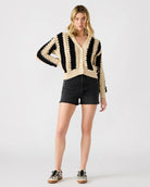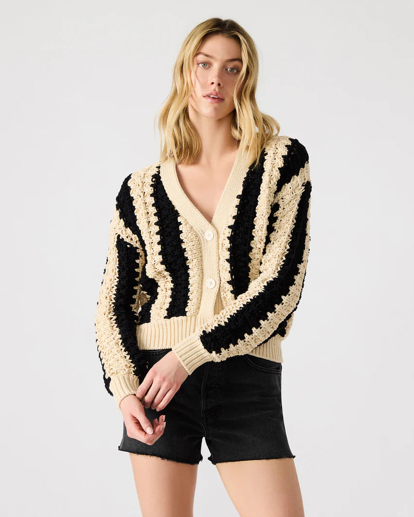 A retro statement with a modern twist. The Lucas Cardigan is a chunky knit dream featuring wide black and cream stripes in a bold, textured pattern. With its slightly oversized fit, deep V-neckline, and front button closure, this sweater is the perfect throw-on-and-go piece for effortless cool.