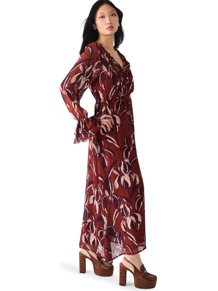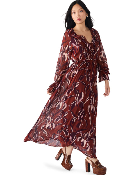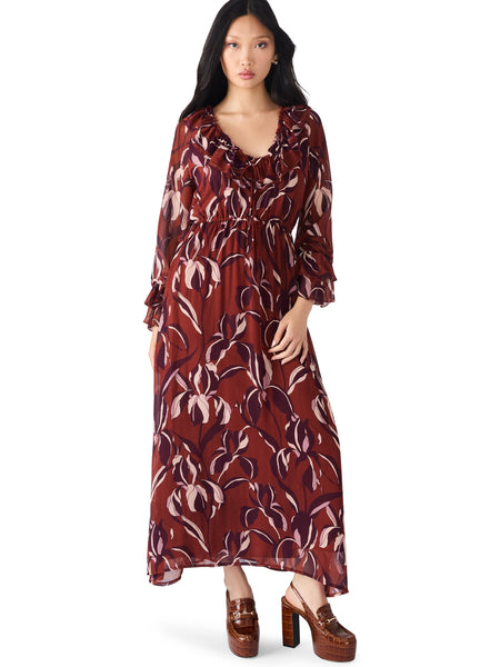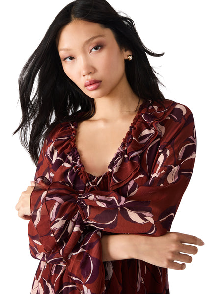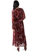 This dress is a romantic statement piece with effortless flow and movement. Designed in a sheer chiffon fabric, it showcases a rich wine-red base with a bold abstract floral print in shades of blush and plum. The silhouette features a deep V-neckline with soft ruffle trim, long sheer sleeves with gathered cuffs, and a flattering empire waist that flows into a breezy maxi skirt. Lightweight and ethereal, it’s perfect for special occasions, autumn evenings, or whenever you want to channel boho elegance with a modern twist.