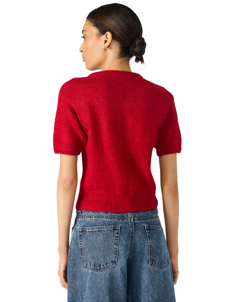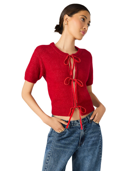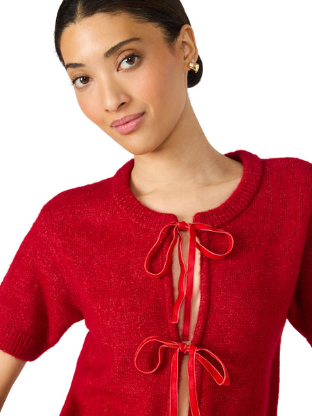 This cropped cardigan adds a flirty twist to a cozy classic. Designed in a rich cherry red knit, it features a soft texture with short sleeves and ribbed trim for a fitted finish. The open front is adorned with three velvet ribbon ties, giving it a feminine, playful touch. Perfect for layering over a cami, bralette, or even a slip dress, this cardigan blends sweet charm with modern appeal—ideal for both casual days and date nights.