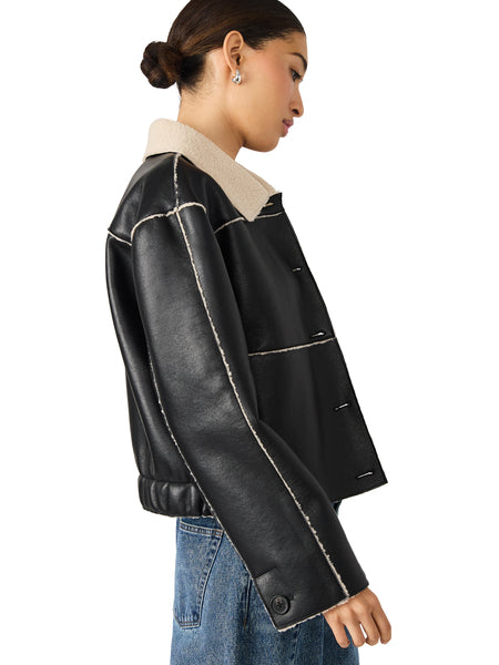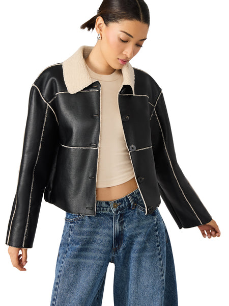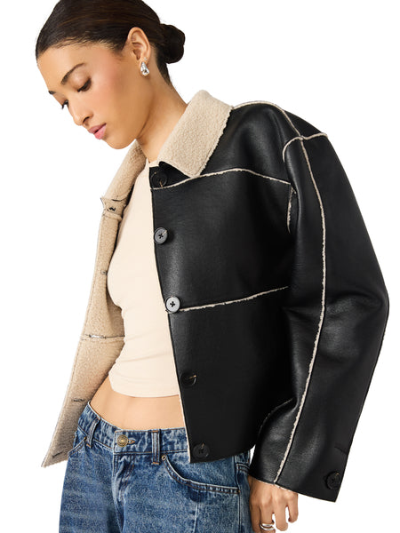 This faux shearling jacket is the ultimate blend of edgy and cozy. Crafted from smooth vegan leather with a plush contrast lining, it features exposed seam detailing for a modern, structured look. The boxy silhouette and cropped length give it an effortlessly cool vibe, while the soft sherpa collar adds warmth and texture. Finished with button-front closures and tailored stitching, this jacket layers perfectly over tees, knits, or turtlenecks for a polished yet relaxed fall-to-winter look.