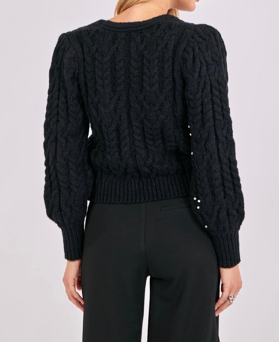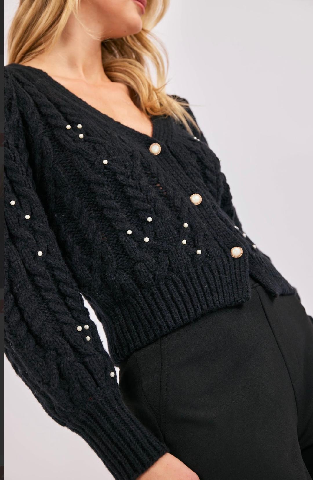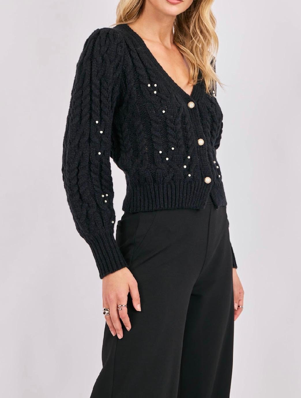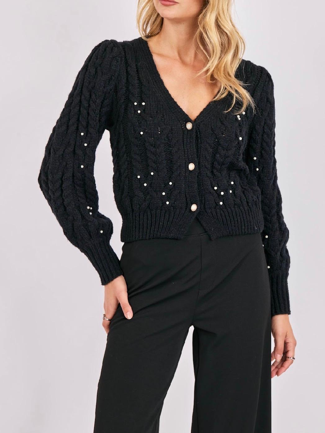 This cardigan is a chic, feminine twist on a classic cable knit. The soft black knit features a beautiful braided texture throughout, while scattered pearl embellishments add a touch of elegance without feeling overdone. The V-neckline and cropped length create a flattering, modern shape, and the pearl-centered buttons tie the whole look together with a luxe finish. Slightly puffed sleeves give it a subtle romantic feel, making it perfect for dressing up denim, pairing with tailored trousers, or styling with one of our satin skirts for holiday events. A standout piece that feels both timeless and special.