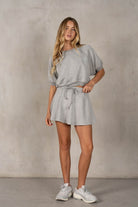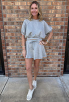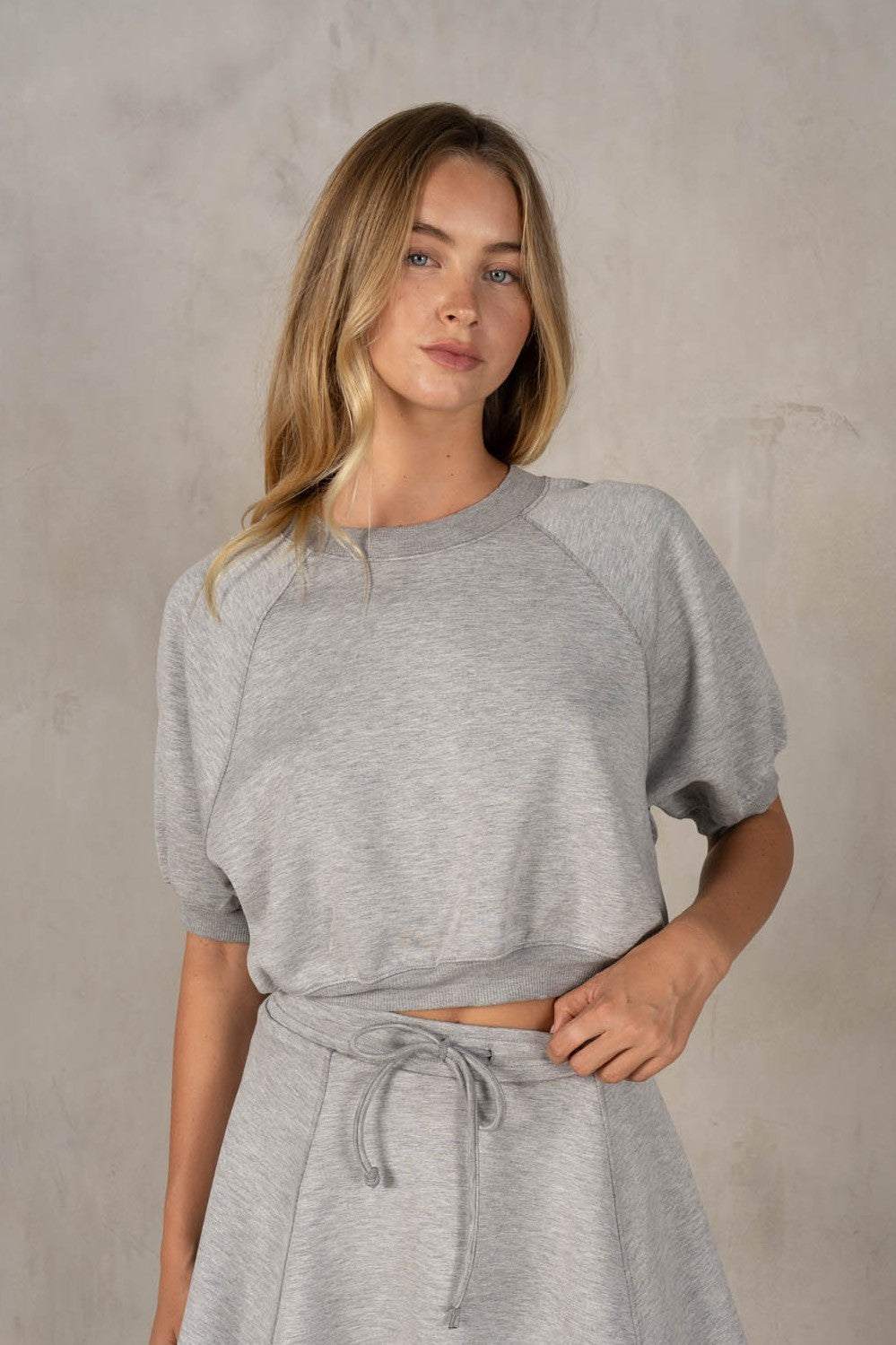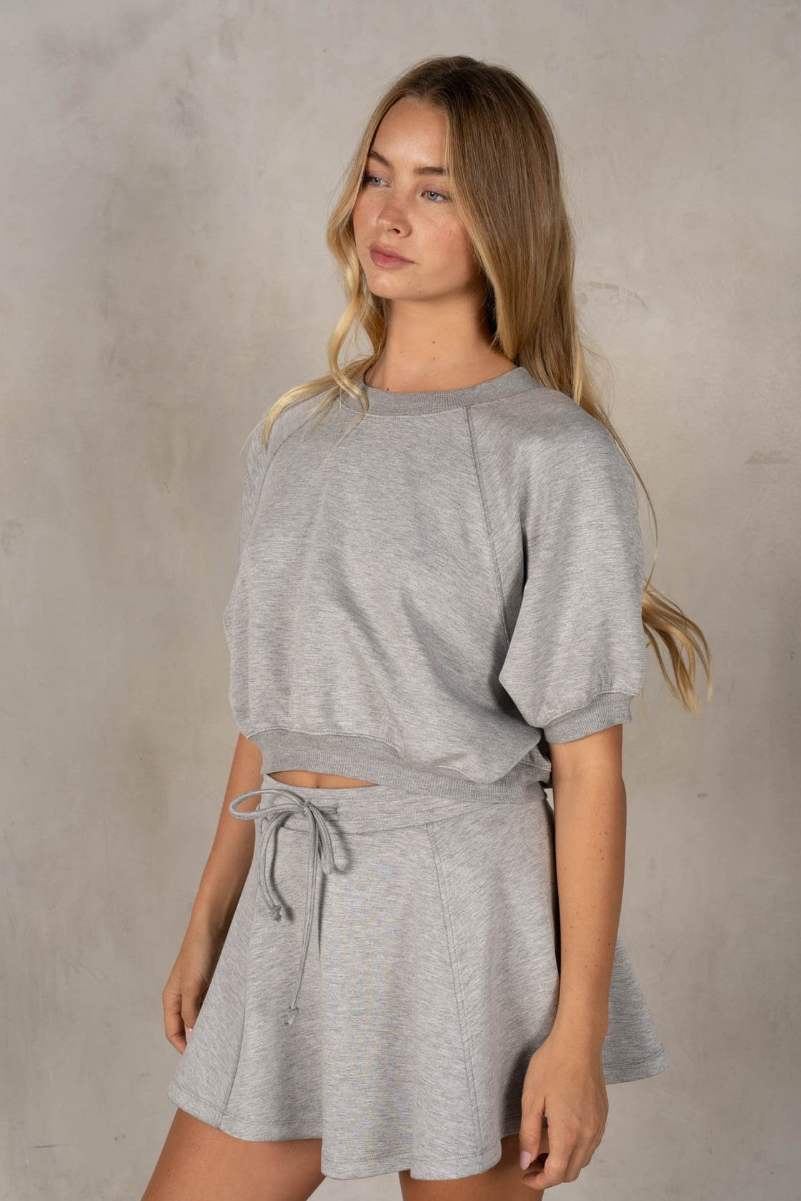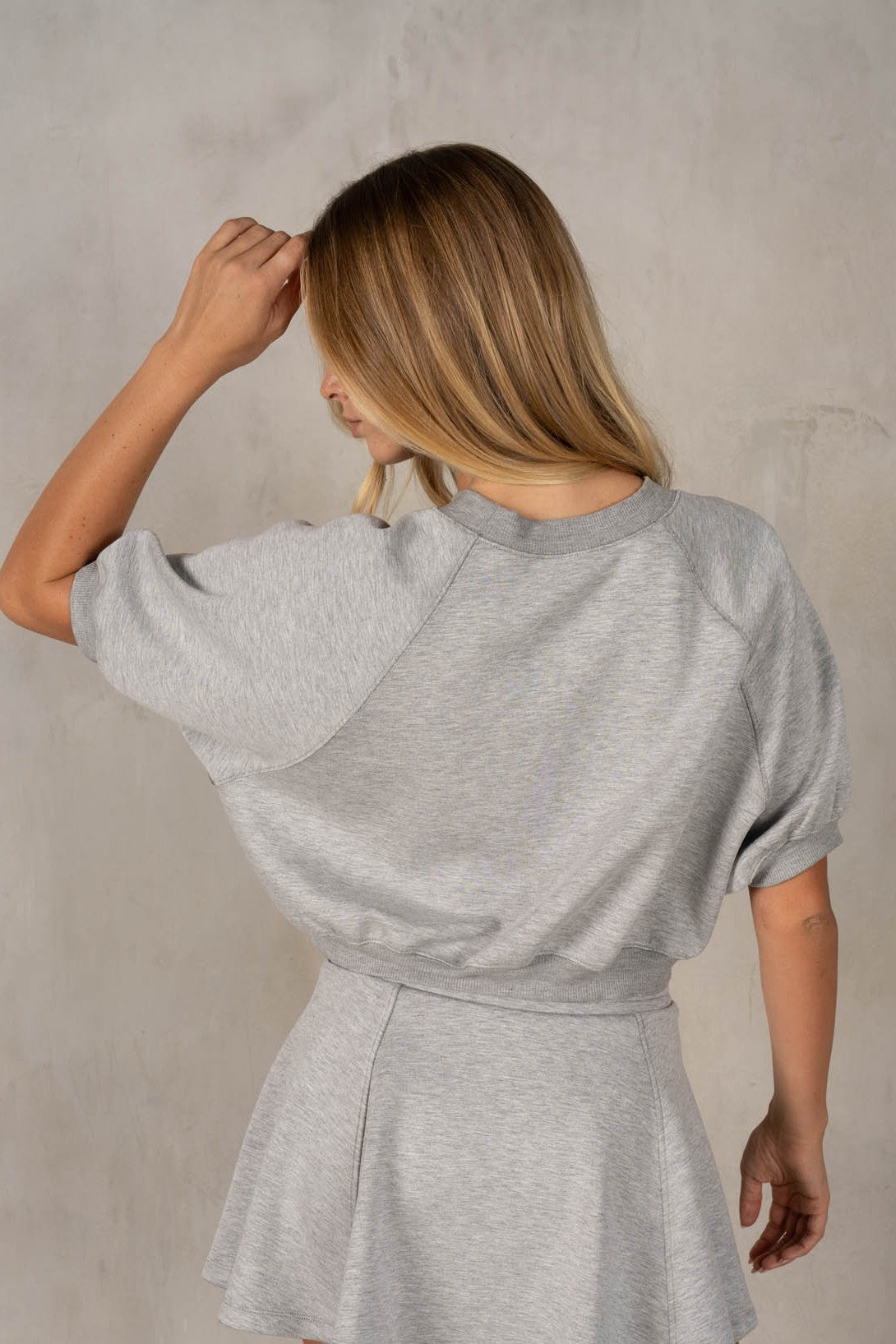 A sporty-chic cropped sweatshirt designed in a smooth neoprene fabric that gives it a structured yet ultra-comfortable feel. Featuring a relaxed fit with raglan-style sleeves and a banded hem, it creates that effortless, slightly blouson silhouette. The clean lines and elevated texture make it an easy go-to for casual days while still feeling polished. Style with its matching skater skirt for a cute, easy outfit!