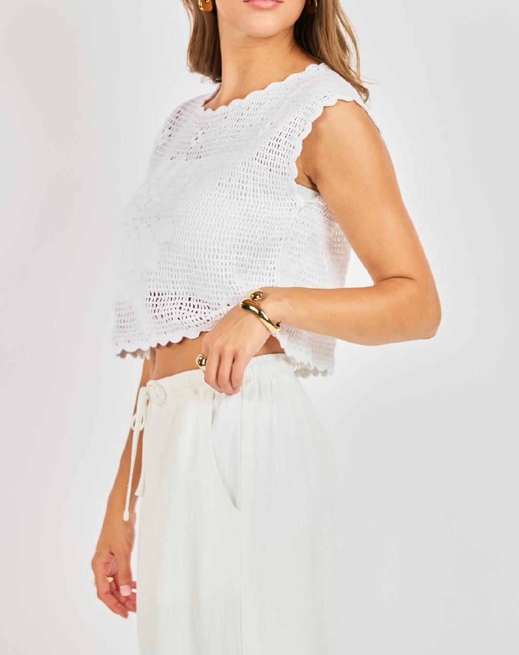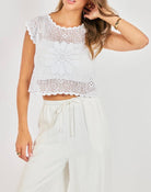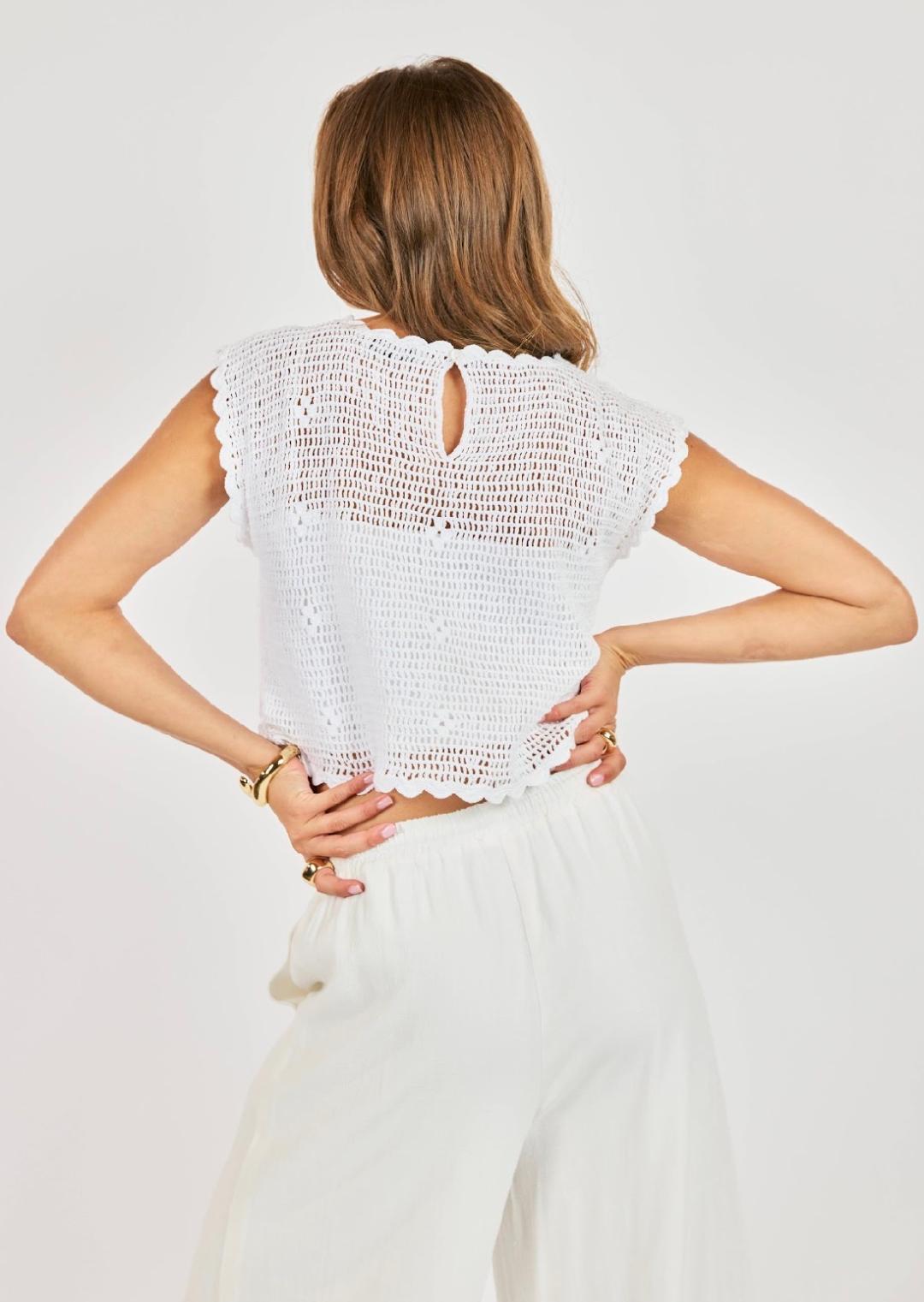 This airy crochet top is the perfect blend of feminine and laid-back charm. Crafted from an open-knit design, it features intricate crochet detailing throughout with a soft, breathable feel that’s ideal for warm-weather styling. Designed with a slightly cropped, relaxed silhouette, it showcases a scalloped neckline, sleeves, and hem that add a delicate, romantic touch. The bodice is highlighted by a subtle floral-inspired crochet pattern, giving it texture and visual interest while still feeling light and effortless. A small keyhole button closure at the back adds a refined finishing detail. Easy to layer over a bralette, tank, or swimsuit, this piece pairs beautifully with flowy pants or denim for an elevated, coastal-inspired look.