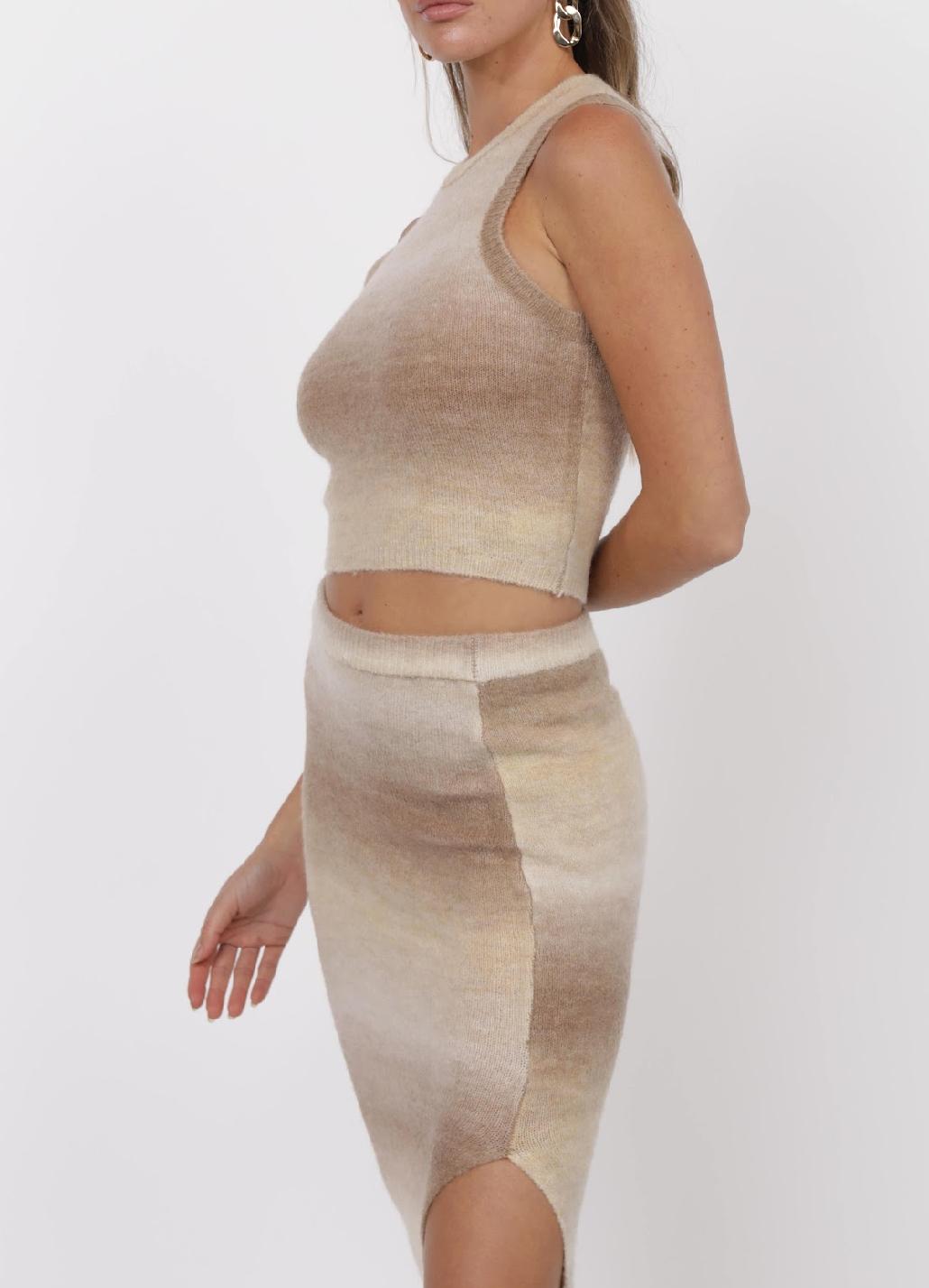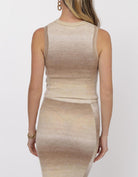 A soft layering staple with a statement finish. This sleeveless sweater tank features a fitted silhouette and crew neckline, designed in a dreamy neutral ombre knit that transitions from cream to warm sand tones. Wear it solo with denim or pair it with the matching midi skirt for a chic, coordinated look.