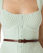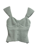 This ribbed knit bustier-style tank in a soft, muted sage/mint tone is the epitome of feminity. It features a soft square neckline with wide straps and a faux button front, giving it that polished, slightly vintage feel. The knit has a sculpting effect with underbust seaming that mimics a corset, creating a flattering, contoured silhouette without feeling restrictive. The vertical ribbing throughout adds texture and structure, while the subtle peplum flare at the hem gives it shape and a feminine finish. The back mirrors the clean, structured look with a squared neckline, keeping it sleek from every angle. Styled with relaxed denim and a slim belt, it balances perfectly between tailored and effortless—that “put together but not trying too hard” vibe. (BELT NOT INCLUDED)