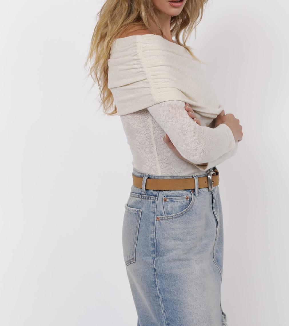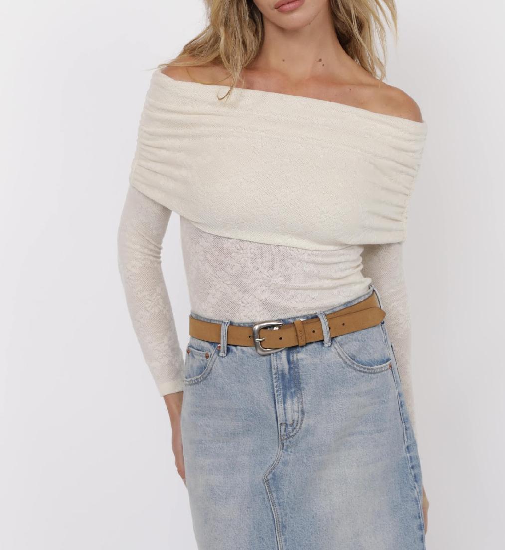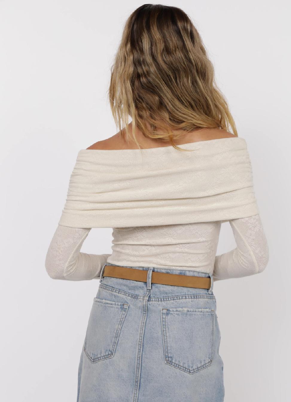 Turn heads with this effortlessly chic off-shoulder knit top. Designed in a soft ivory jacquard fabric, it features a draped fold-over neckline that highlights the shoulders for a feminine, romantic look. Subtly sheer with a delicate woven pattern, adding texture and elegance. Fitted through the body, this top pairs perfectly with denim or skirts for both casual outings and elevated evenings.