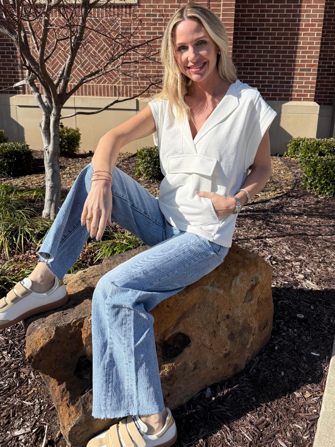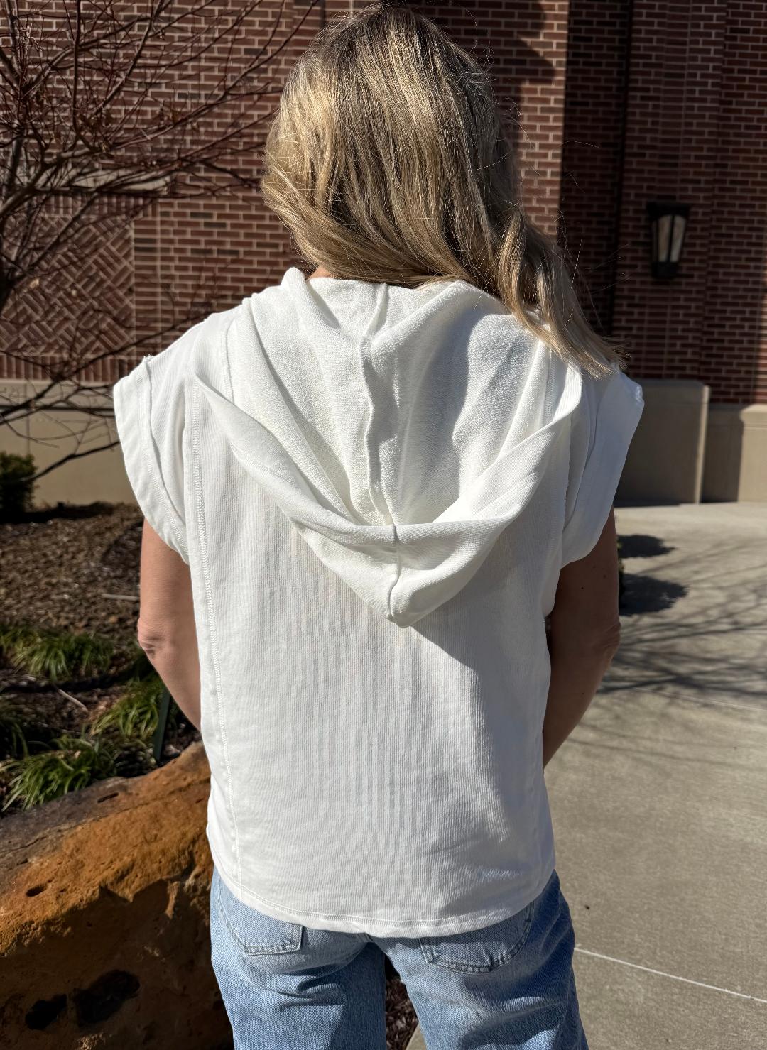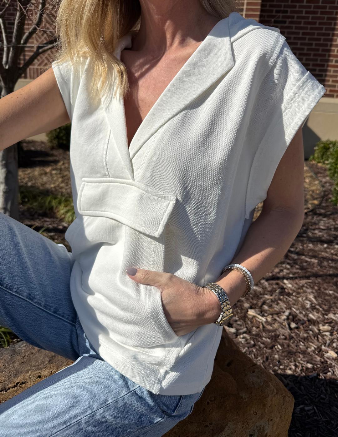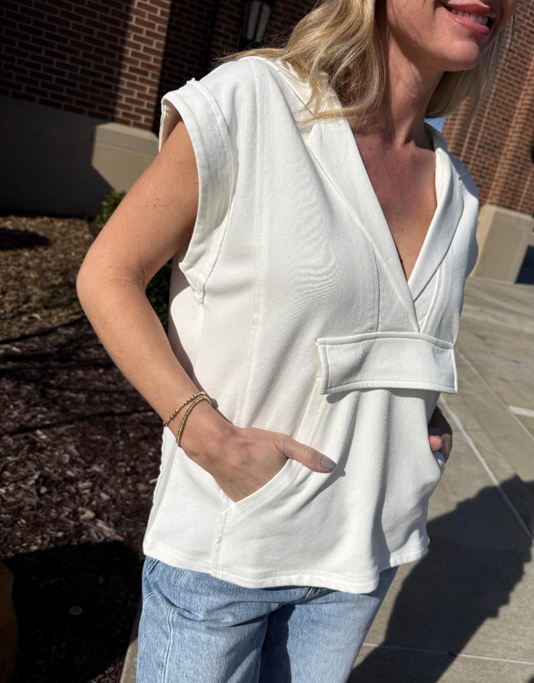 This elevated sleeveless hoodie top blends laid-back comfort with thoughtful design details. Made from a french terry knit, it features a flattering V-neckline with a relaxed hood, giving it an effortless, modern feel. The front kangaroo pocket adds a casual utility touch, while subtle seam detailing and a slightly structured silhouette keep it polished. Easy to wear now and later, it’s the perfect in-between piece—great on its own, layered under jackets or over a fitted long sleeve.
