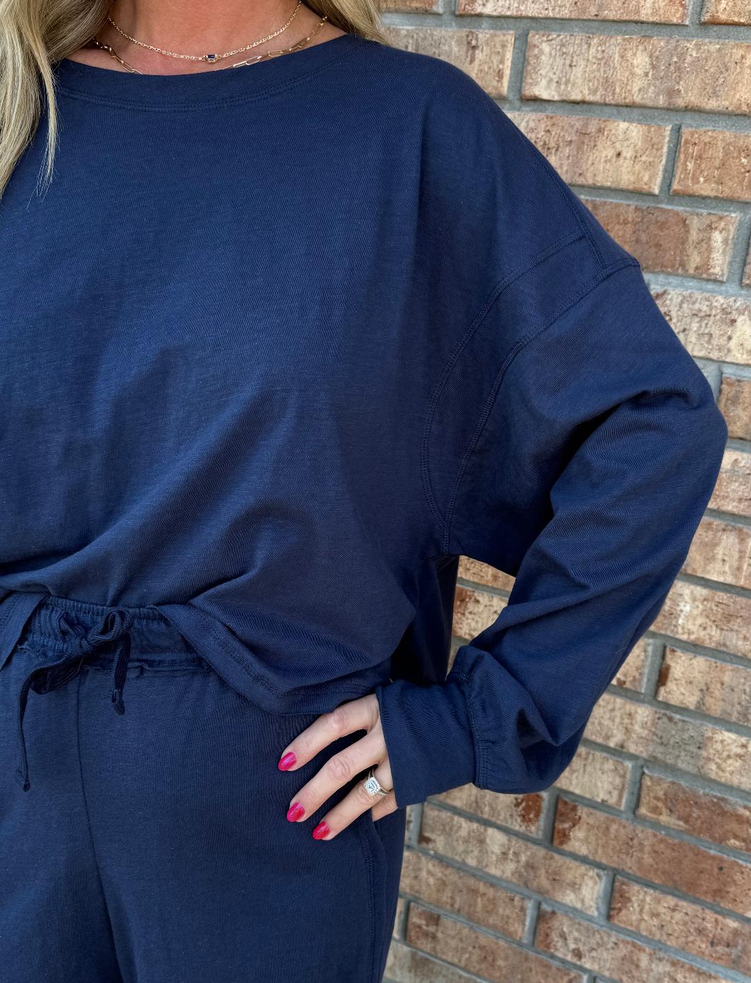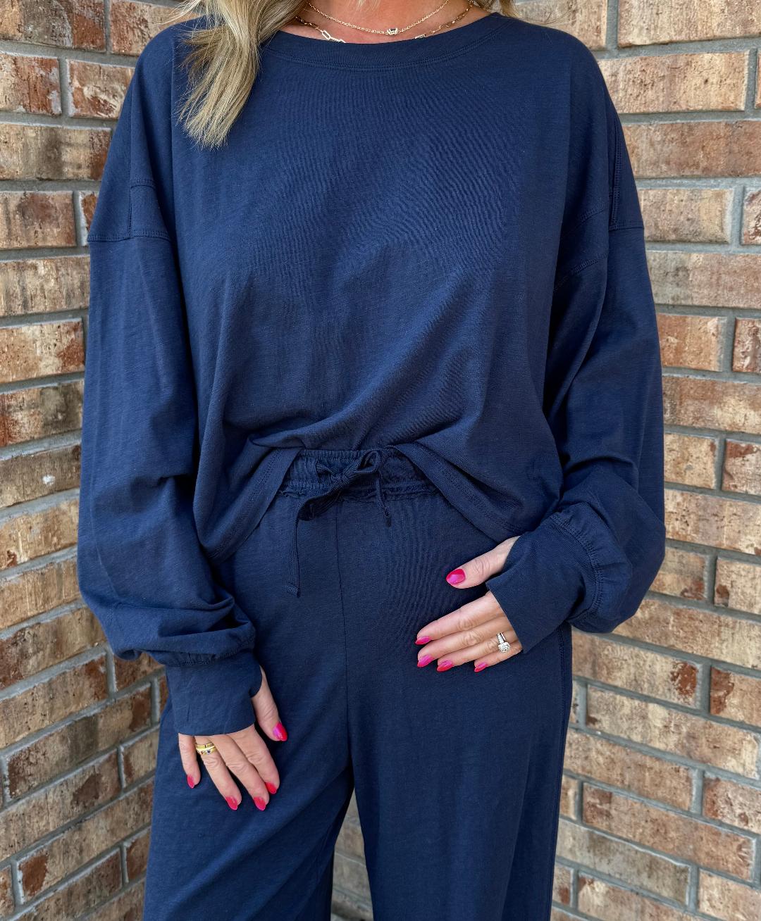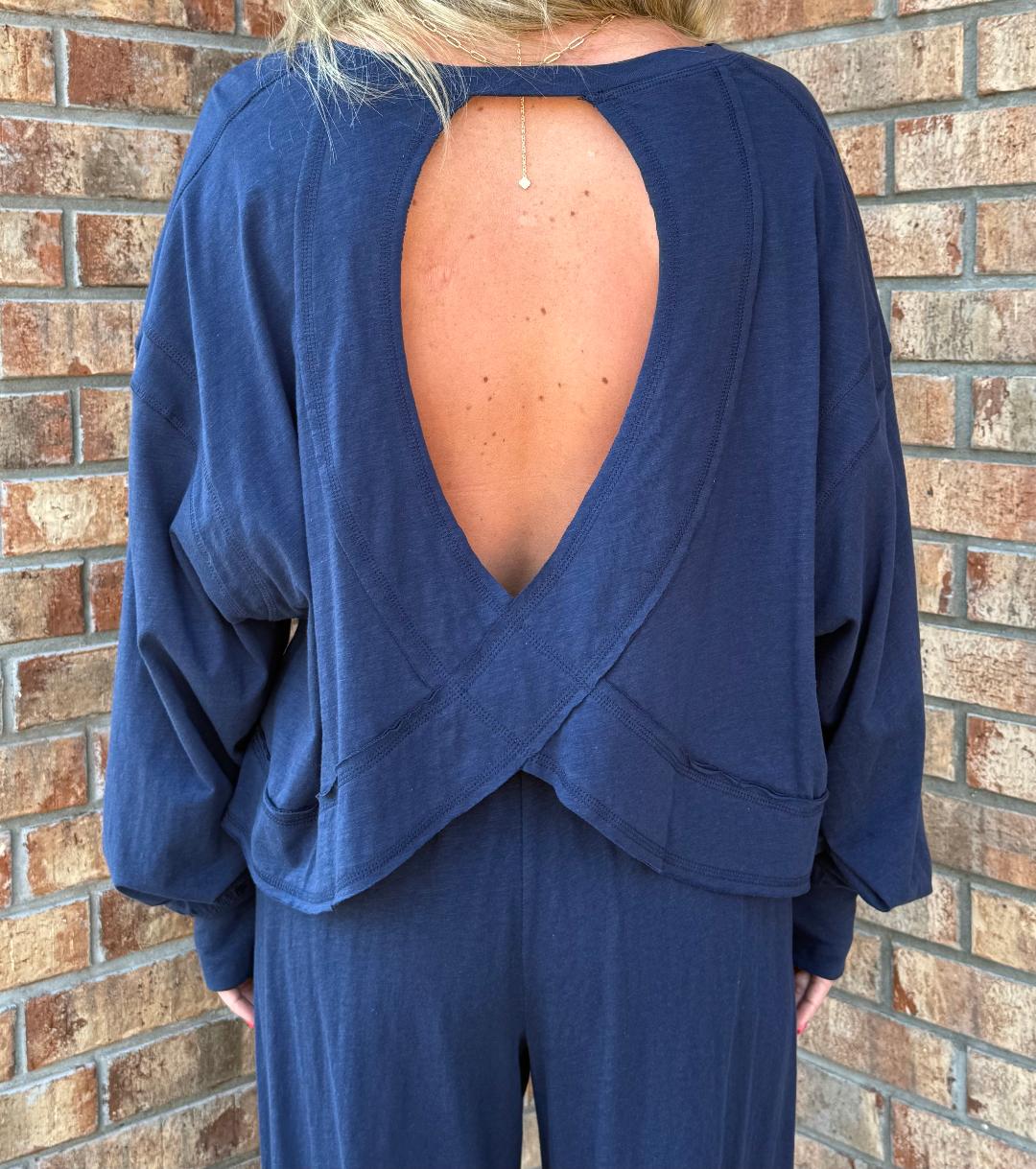 A chic twist on casual comfort, this navy cotton slub pullover features a relaxed fit with dropped shoulders and long sleeves. The front keeps it simple with a crew neckline and laid-back silhouette, while the back steals the show with a dramatic open cutout and crisscross hem detail—perfect for showing off a delicate bralette or jewelry. Lightweight and breathable, it’s the ultimate off-duty top with a touch of unexpected edge. Style back to the matching pant or wear with your favorite jeans.