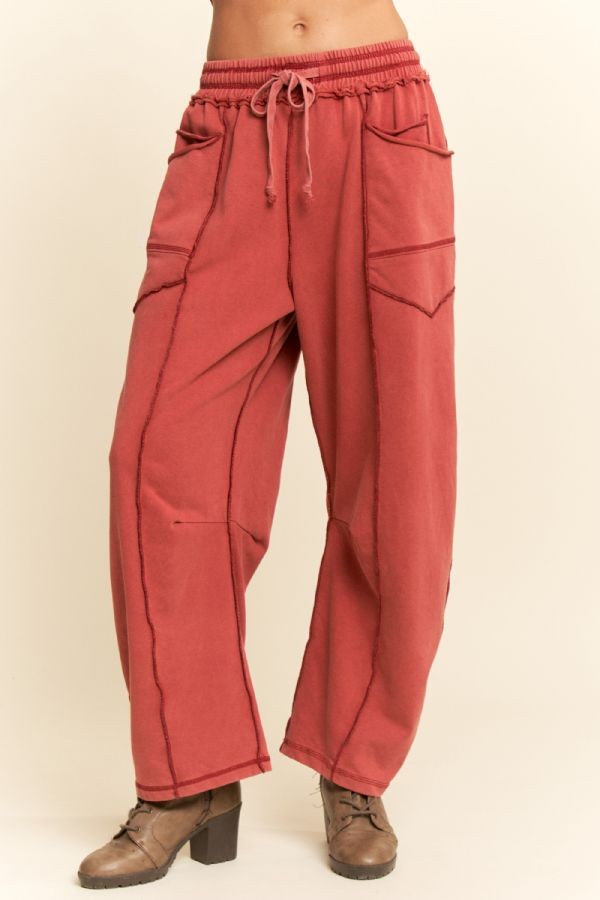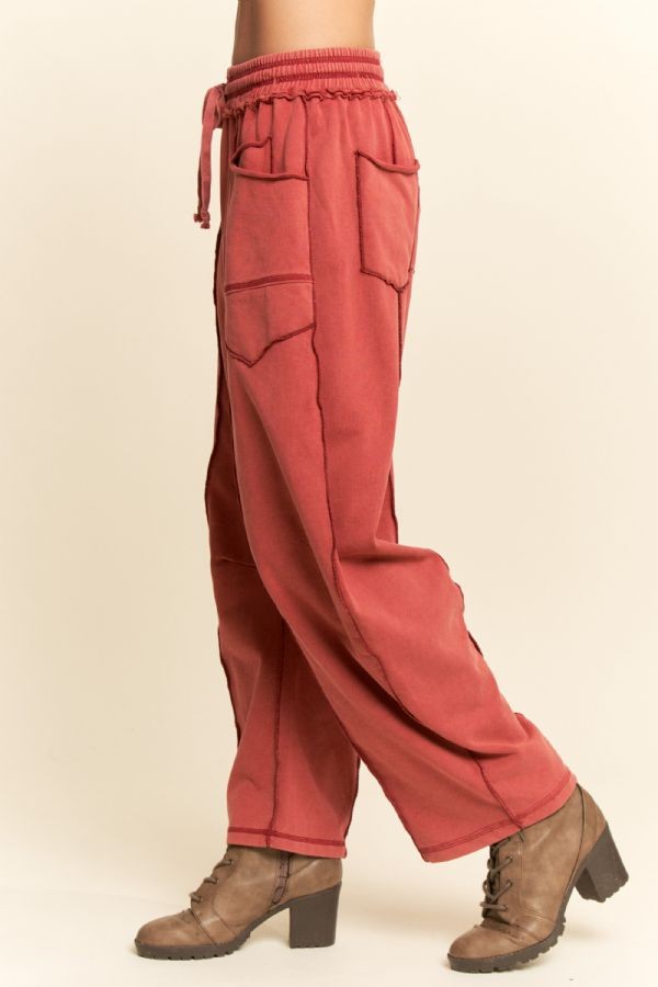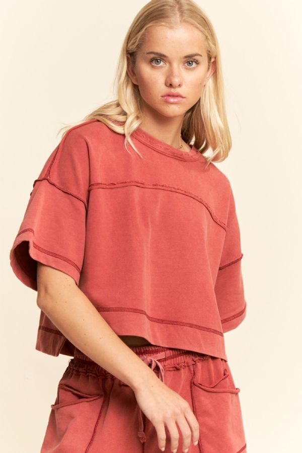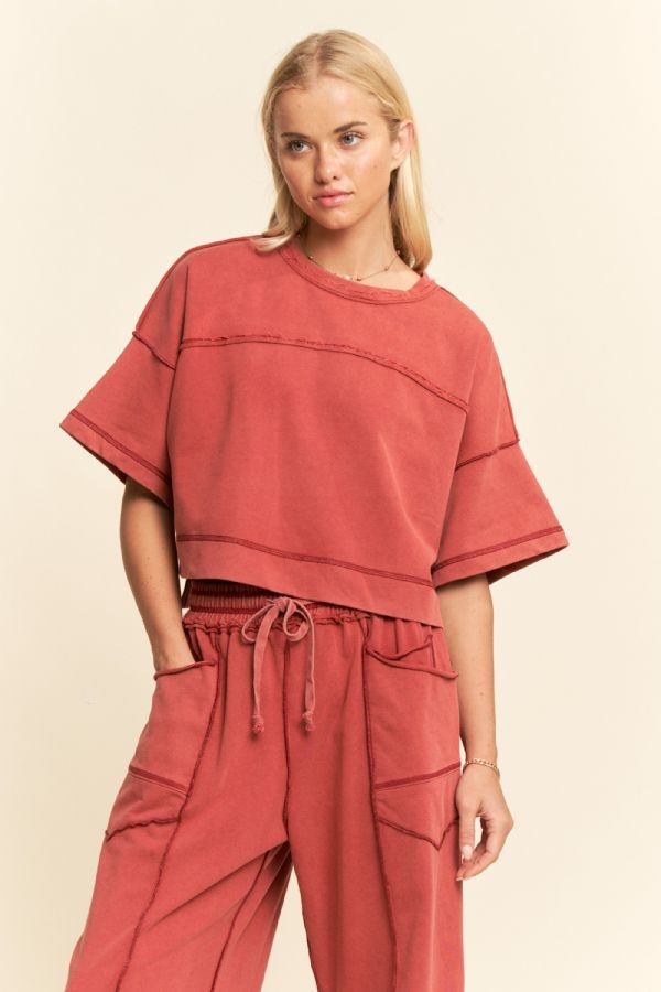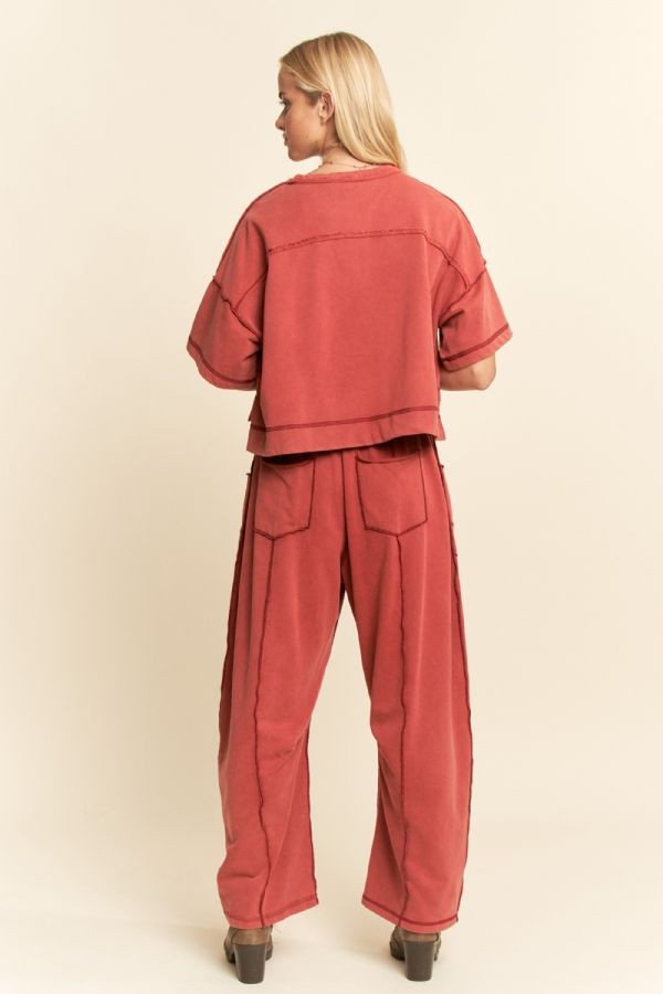 This two-piece mineral wash set offers a premium take on casual comfort. Designed with exposed seam detail and oversized patch pockets, the cropped top and relaxed pants deliver a modern, lived-in look with elevated finish. Ideal for easy outfitting with an artisan-inspired edge.