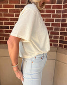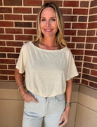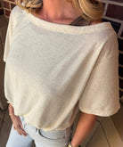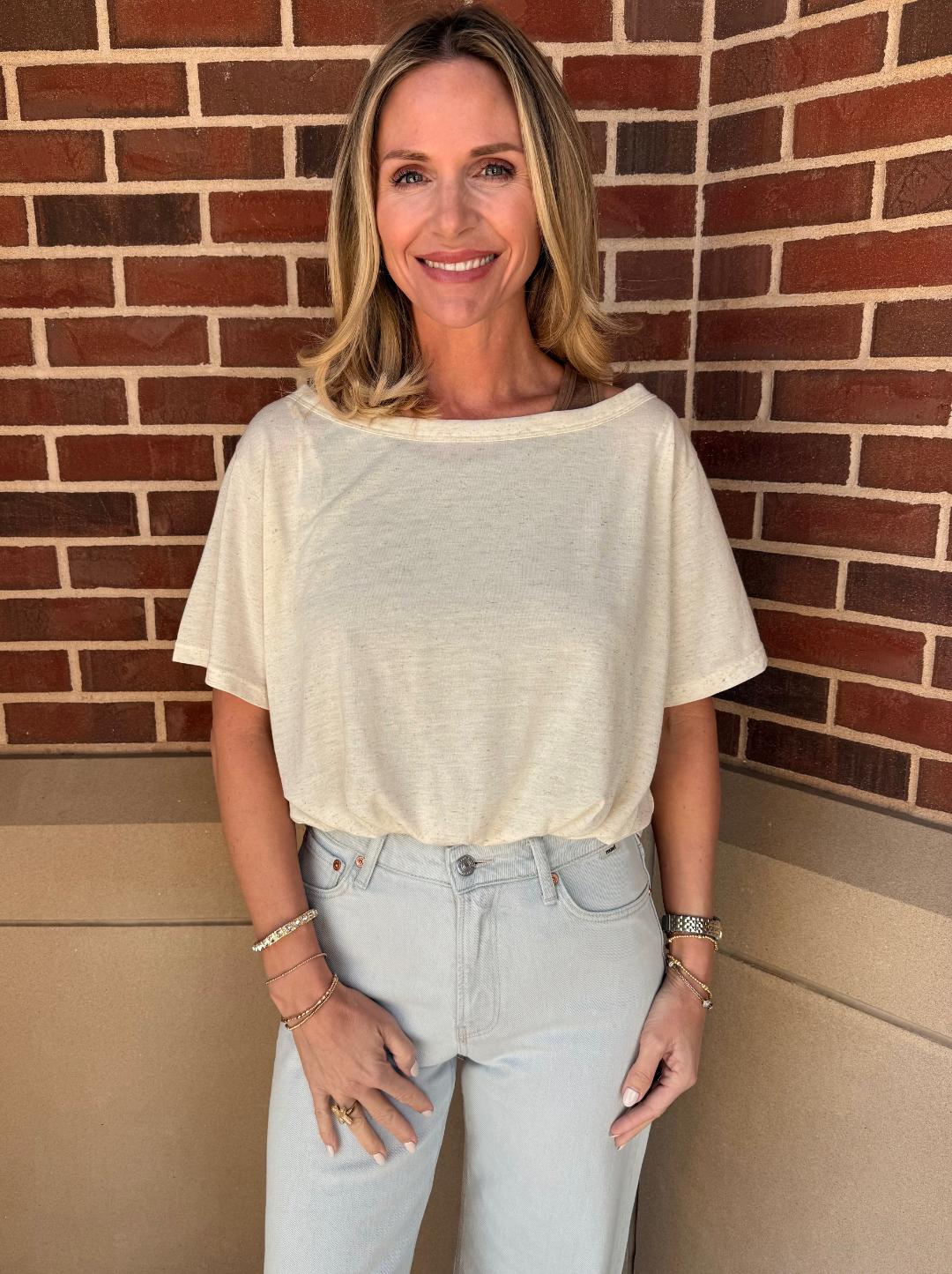 An elevated take on your everyday tee, this effortlessly cool style features a soft heathered oatmeal top layer with a relaxed, drapey fit and wide neckline for that perfectly laid-back feel. The layered detail peeks through with a contrasting mocha underlayer at the neckline and back, adding depth and dimension. The standout feature is the bubble hem silhouette, where the bottom layer is attached in the front to create a subtle blouson effect that gives shape without sacrificing comfort.