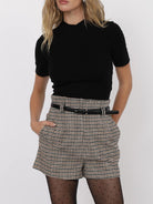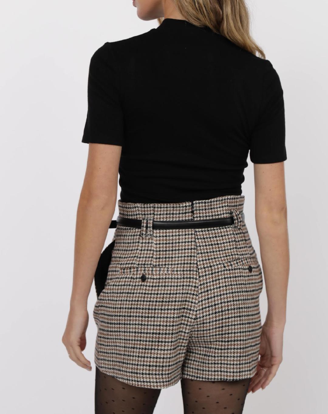This piece is a sleek, form-fitting knit top in solid black. It has a modest mock neckline and short sleeves, lending it a polished yet understated feel. The knit fabric is soft with a bit of stretch for a smooth, body-hugging fit that tucks easily into high-waisted bottoms. Its minimalist design makes it versatile enough to pair with a variety of looks—from work-appropriate with a blazer to casual with jeans—while the mock neck adds a touch of sophistication. Shown styled here with our Memorabilia Belted Shorts.