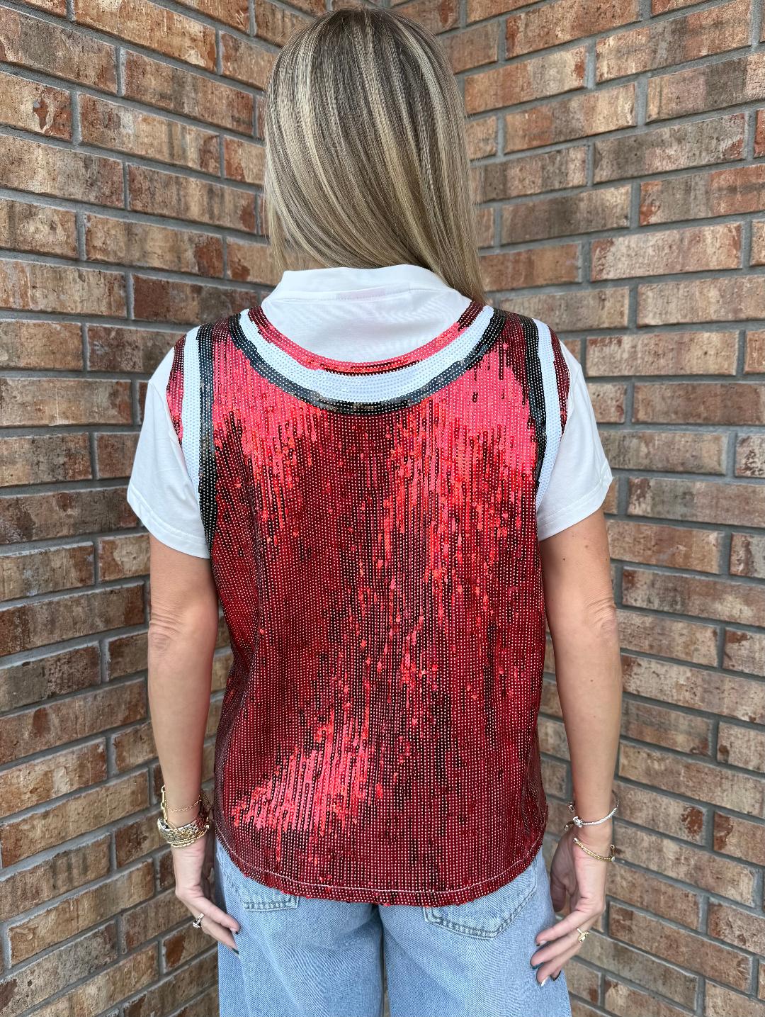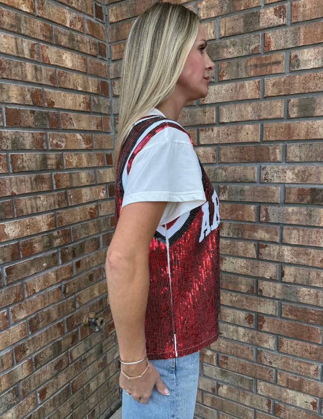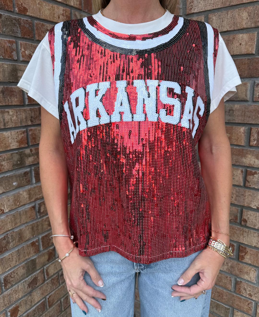 This eye-catching Queen of Sparkles tee brings game-day glam to a whole new level. Featuring a bold sequin design giving the look of a jersey layered over a tee. With “ARKANSAS” spelled out across the front in varsity-style lettering, it channels vintage basketball jersey vibes with a sparkling twist. The relaxed fit and soft white cotton base layer make it both comfortable and statement-worthy. Perfect for cheering on the Razorbacks in standout style, this top pairs effortlessly with denim, faux leather shorts, or a mini skirt for a spirited yet chic look.