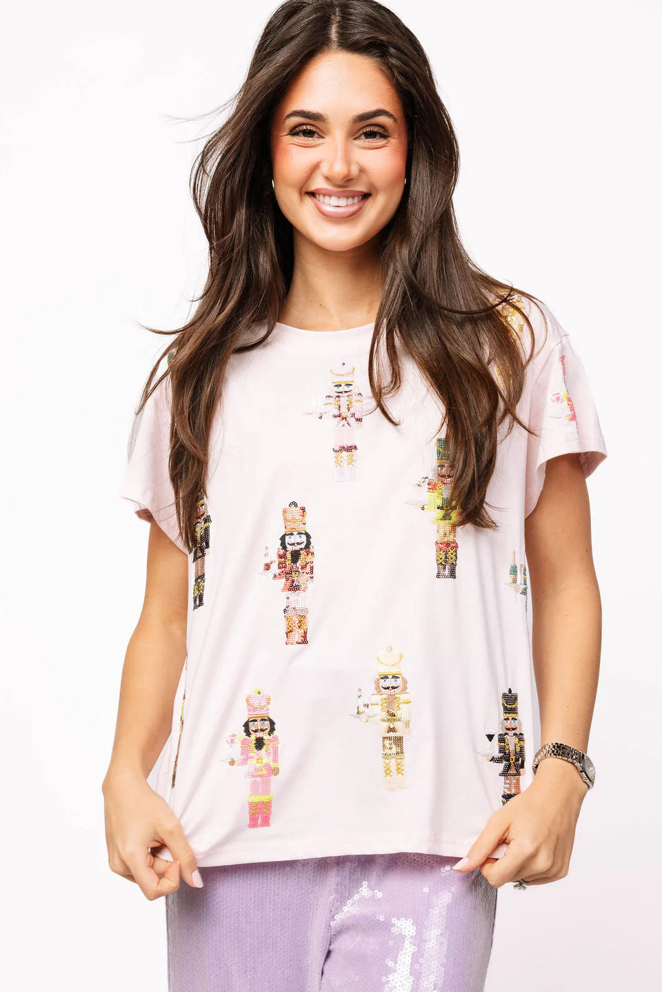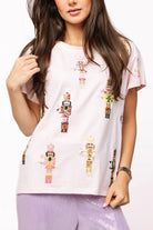 This Queen of Sparkles Light Pink Nutcracker Serving Tee is a festive favorite that blends playful charm with signature sparkle. Crafted from soft, lightweight cotton, the relaxed-fit tee is covered in colorful sequin and bead-embroidered nutcrackers, each uniquely detailed in vibrant hues of pink, gold, green, and red. The shimmering embellishments add dimension and holiday cheer, while the blush pink base keeps the look feminine and chic. Pair it with sequined bottoms or jeans for a fun, glam holiday outfit that captures the whimsy of the season — perfect for parties, parades, or casual Christmas festivities.