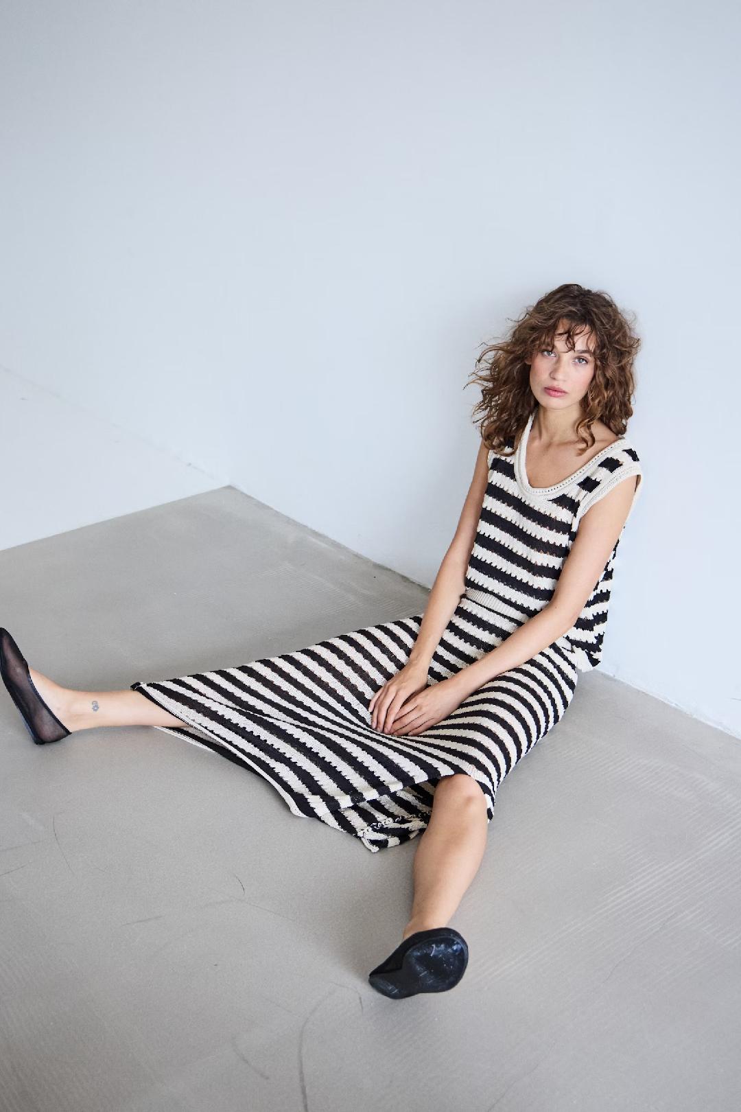 Summer knits and crochet pieces are this summer's must-have additions to your wardrobe. This black and almond stripe crochet tank has a matching skirt for a chic, "cool girl" vibe. Mix it up and style the tank back to any of your favorite bottoms.