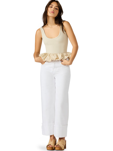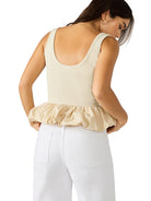 This neutral-toned peplum tank from Steve Madden brings playful structure to a casual essential. Made from a soft ribbed knit, the fitted bodice flatters with its scoop neckline and wide straps, while the voluminous poplin ruffle hem adds a fun and feminine finish. The contrasting textures make this tank an easy standout—whether styled with crisp white denim or relaxed trousers for a modern mix of casual and chic. We love it with our Moxie Snake Print Pant.