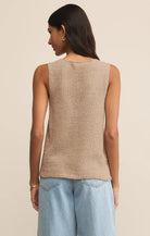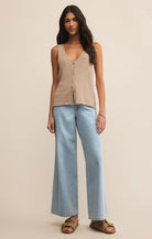 Relaxed and effortlessly stylish, this sleeveless sweater vest features a textured tape yarn knit, an easy v-neck, and button-up styling. It's the perfect lighter layer worn on its own and the epitome of summer-into-fall chic.