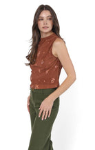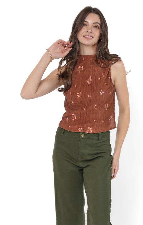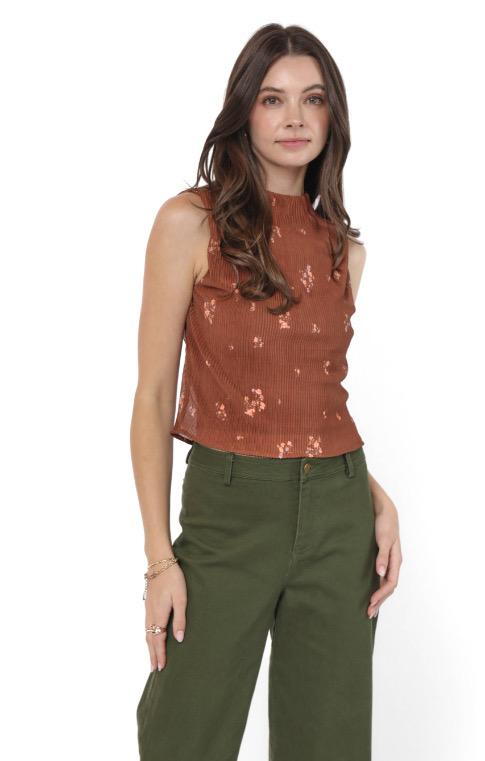 The Rust Blossom Pleated Top is the perfect mix of polished and playful. Made from a lightweight pleated mesh, this sleeveless top features a high neckline, a keyhole back button closure, and a subtle floral print that softly pops against the warm rust hue. Slightly cropped for easy styling, it's a go-to piece for pairing with high-waisted denim, trousers, or skirts. A fall-forward favorite that transitions seamlessly from work to weekend.