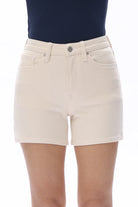 A clean, polished take on everyday denim, these off-white shorts are designed with a flattering high-rise fit and just the right amount of stretch for all-day comfort. The soft, structured fabric hugs in all the right places while still allowing easy movement, making them a go-to for everything from casual days to dressed-up moments. Finished with classic five-pocket styling, belt loops, and a zip fly with button closure, they feature a smooth, tailored silhouette with a clean hemline for a more elevated feel. The neutral wash makes them endlessly versatile—pair with anything from crisp button-downs to relaxed tees for an effortlessly refined look