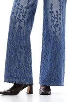 These jeans are a true statement piece—romantic, artistic, and crafted. Made in a classic medium-wash denim, this high-rise wide-leg style features allover tonal floral embroidery that climbs up the legs like vines. The textured stitching gives the denim dimension and softness while still feeling modern and elevated. The fit is structured with stretch through the waist and hip, then opens into a relaxed, dramatic wide leg with a raw, frayed hem for a touch of casual edge. They offer that perfect mix of feminine detail and laid-back denim cool. These jeans bring instant personality to any outfit—dress them up with a silk blouse or keep them weekend-casual with a simple knit.