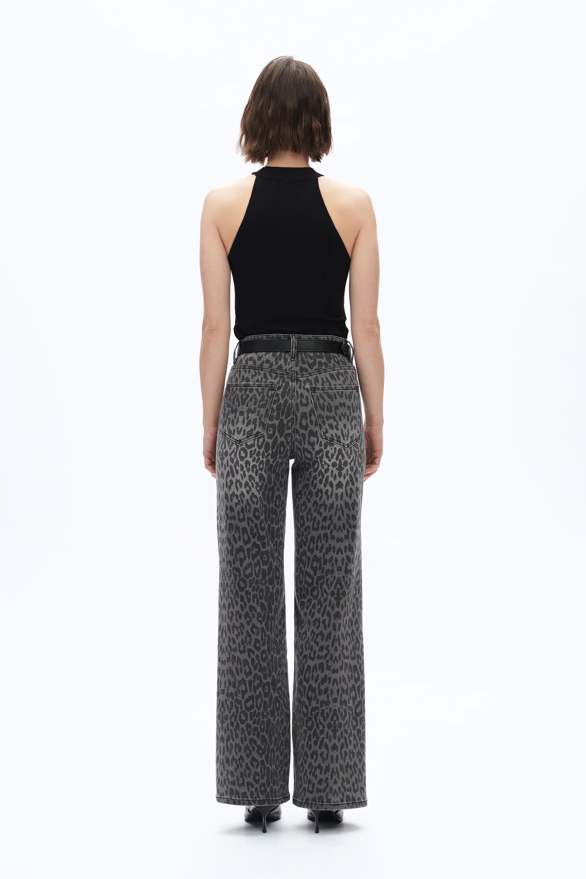 High rise leopard print wide leg jeans, five-pocket design, zipper closure, all-over leopard print, hand-faded finish on front and back.