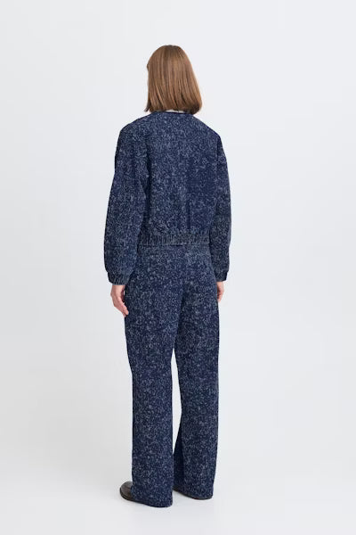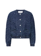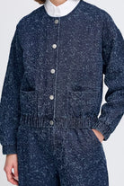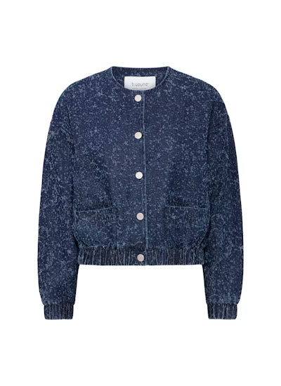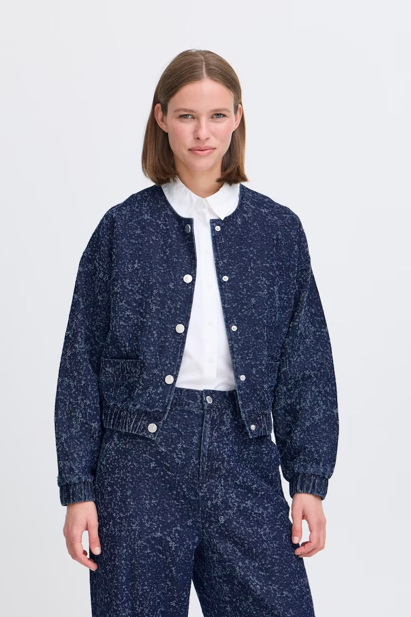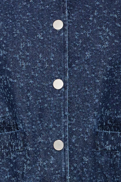 This dark textured denim jacket is cut from the same non-stretch denim as its matching trouser, creating a cohesive look. It has a classic round neckline and snap button front, offering a tailored edge, while its relaxed fit keeps it casual and easy to layer. Functional front welt style pockets add utility, and the structured fabric gives it a crisp, modern feel.
