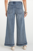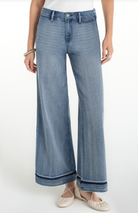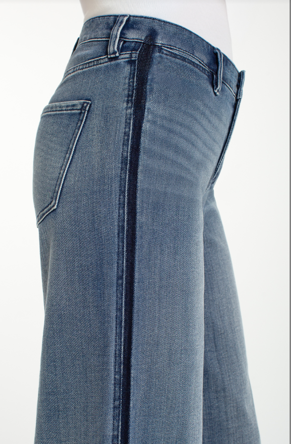 These Liverpool jeans feature a modern wide-leg silhouette with a high-rise fit that flatters through the hips and drapes effortlessly down the leg. Crafted from Liverpool’s signature soft-touch denim, they offer gentle stretch for comfort while maintaining their shape throughout the day. A medium indigo wash is elevated with a darker side stripe that visually elongates the legs, and the hemline with contrast banding adds a unique, tailored finish. The design includes classic five-pocket styling, zip fly with button closure, and clean back pockets for a polished look. Perfect for pairing with fitted tops, sweaters, or tucked-in blouses — these jeans balance relaxed sophistication with everyday wearability.