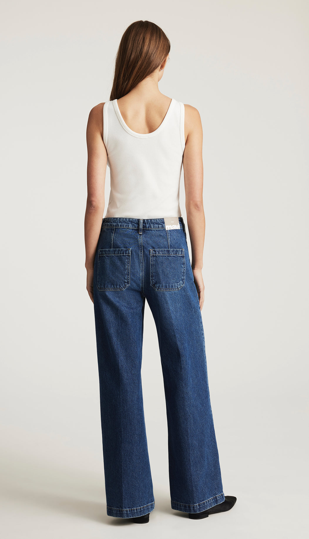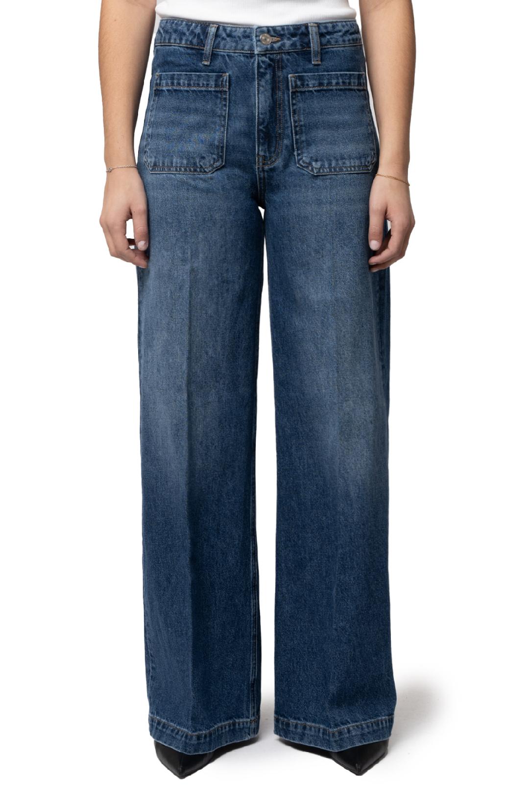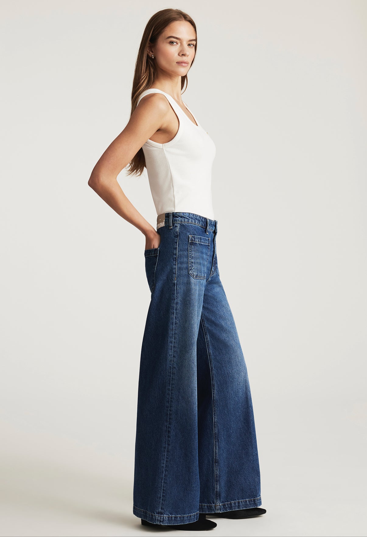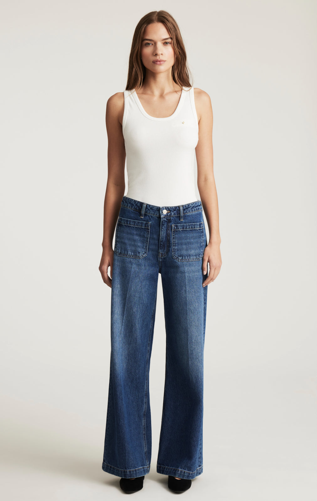 Timeless denim with a modern twist, these non-stretch jeans are crafted from 100% cotton for that authentic vintage feel. Designed with a flattering high rise, wide leg silhouette, and statement front patch pockets, they deliver both comfort and cool. The medium indigo wash makes them endlessly versatile—perfect for pairing with everything from a sleek bodysuit to a cozy knit. Effortless, laid-back, and always in style through any season.