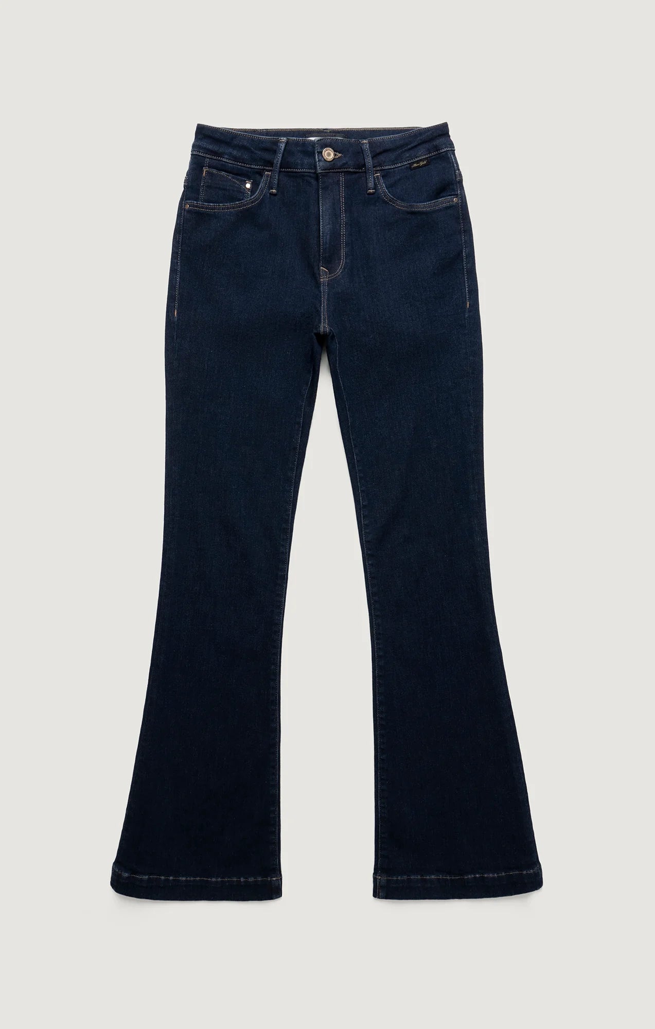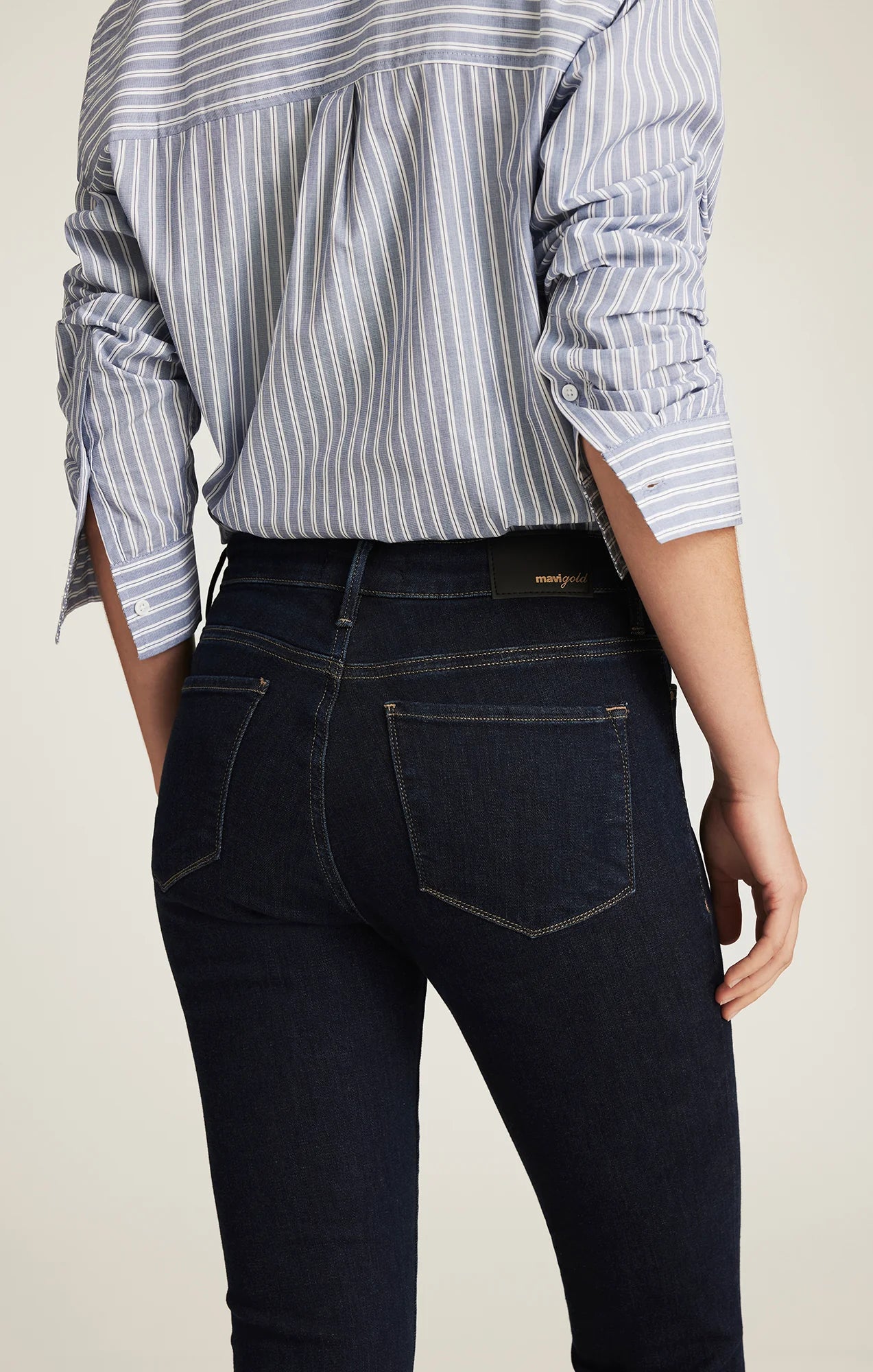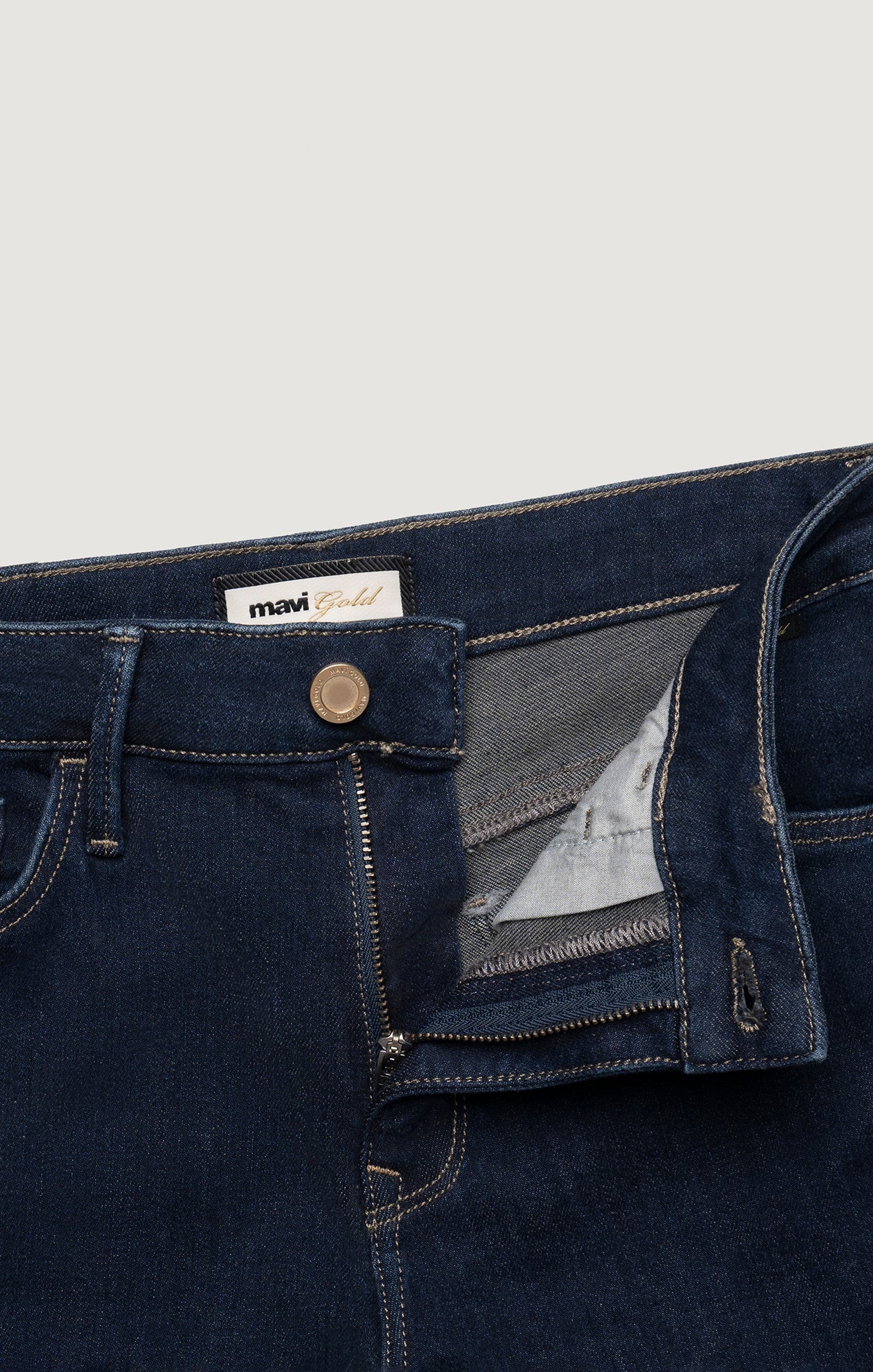 Our Mavi Sydney fit is an ultra-feminine flare with a leg-lengthening silhouette. The mid rise flatters your curves and feels effortlessly comfortable. This pair is finished in a midnight blue rinse wash. Gold Premium combines timeless elegance with modern comfort. This style is made with recycled cotton, delivering soft, flexible denim you can feel good about. It features body-hugging stretch that flatters every body type with a smooth, supportive feel. Gold-toned buttons and accessories elevate the look with a subtle hint of luxury, perfect for everyday wear and special occasions.