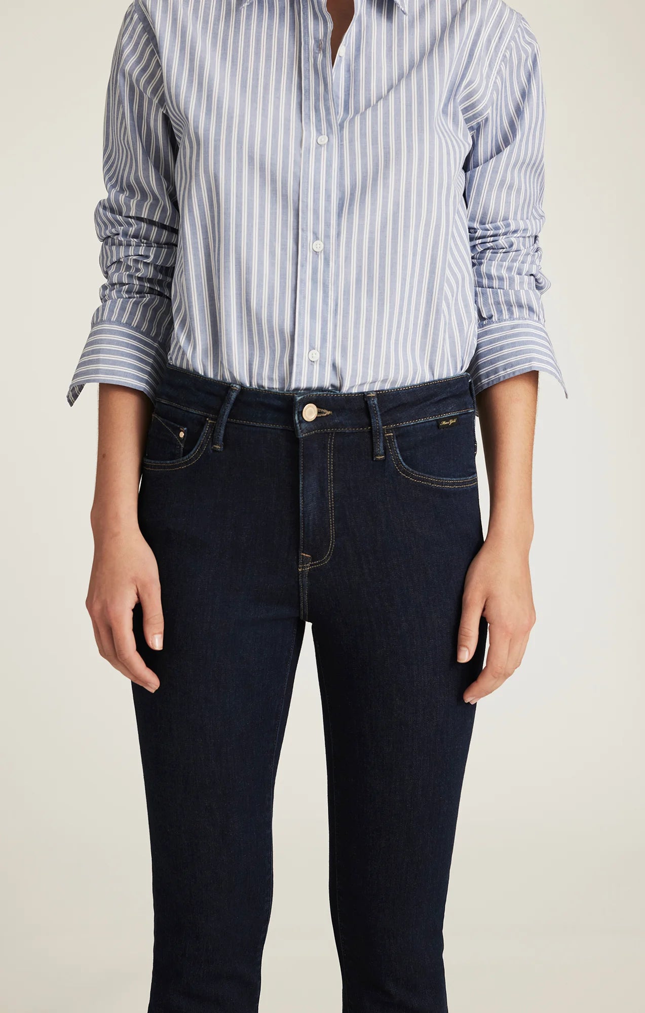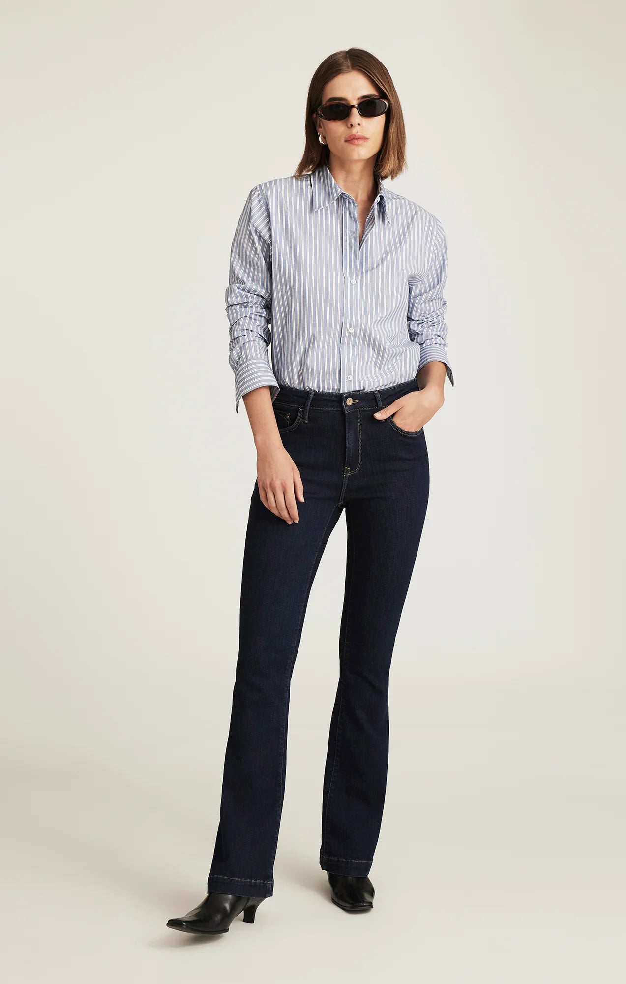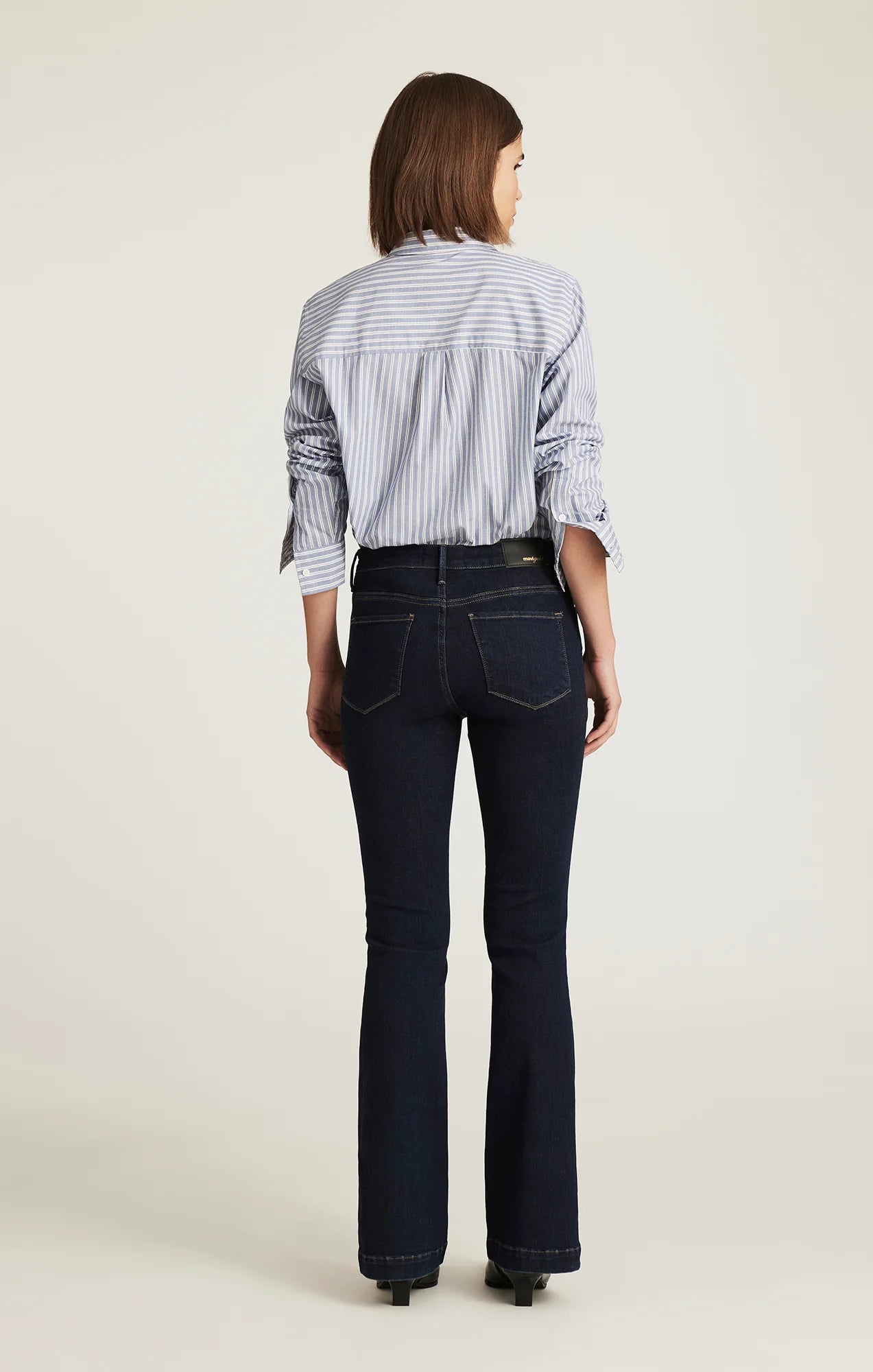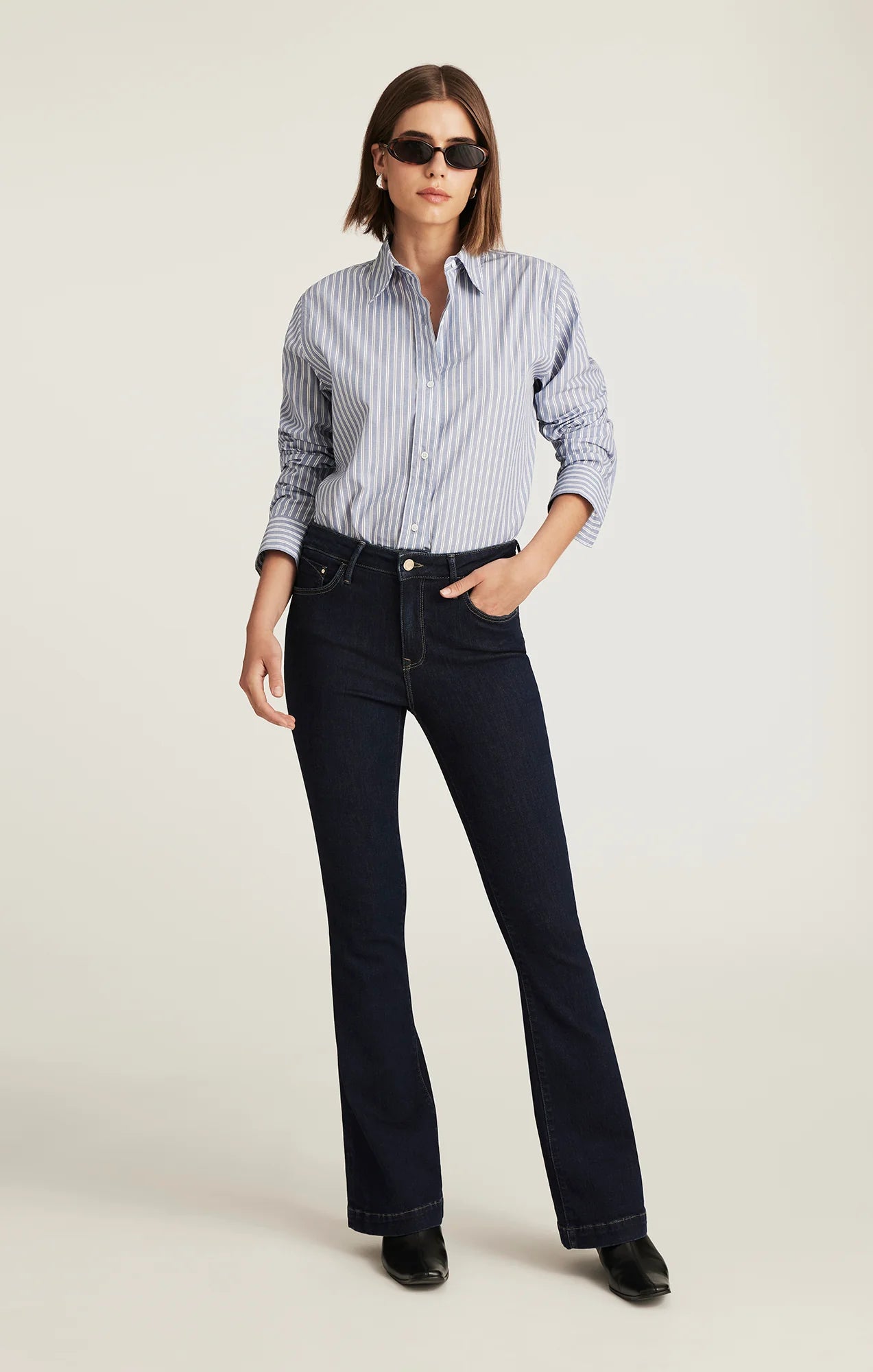 Our Mavi Sydney fit is an ultra-feminine flare with a leg-lengthening silhouette. The mid rise flatters your curves and feels effortlessly comfortable. This pair is finished in a midnight blue rinse wash. Gold Premium combines timeless elegance with modern comfort. This style is made with recycled cotton, delivering soft, flexible denim you can feel good about. It features body-hugging stretch that flatters every body type with a smooth, supportive feel. Gold-toned buttons and accessories elevate the look with a subtle hint of luxury, perfect for everyday wear and special occasions.